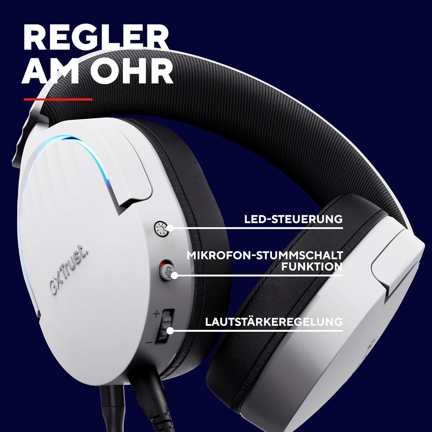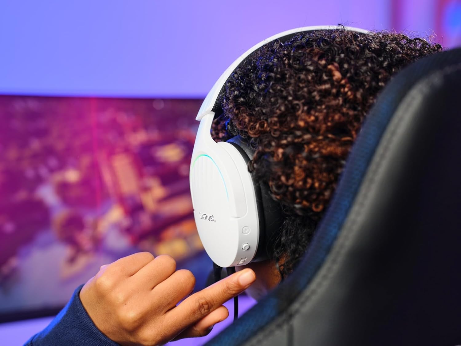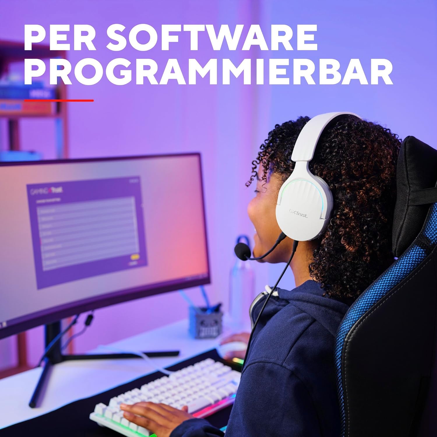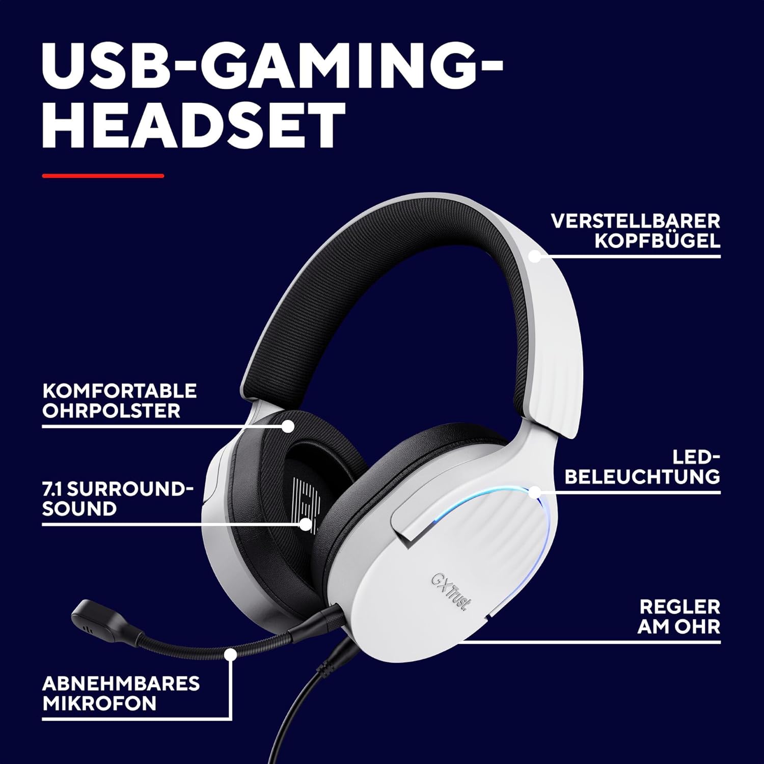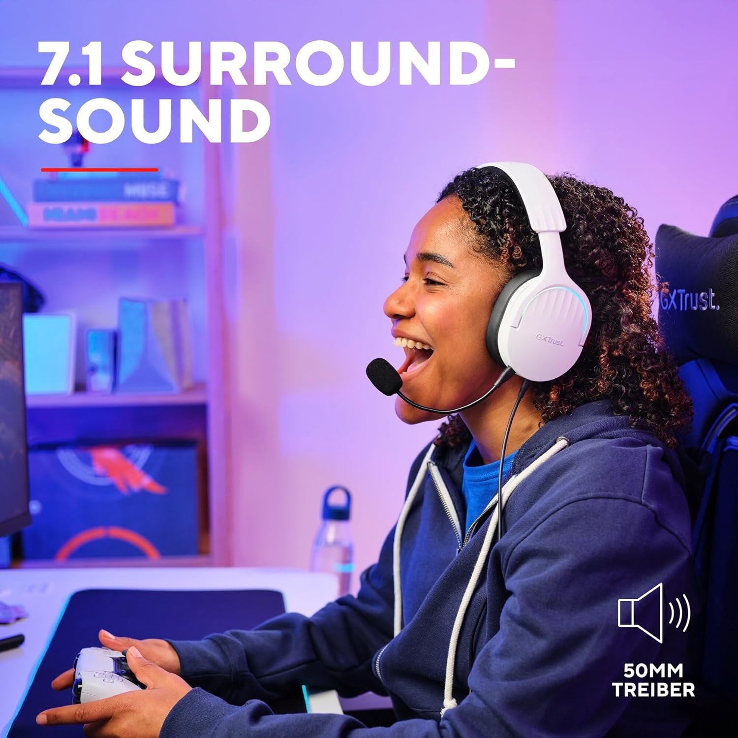 Геймърски слушалки Trust Gaming GXT 490W Fayzo 7.1 с USB Surround Sound, 50 мм драйвери, 2 м кабел, 35% рециклирана пластмаса, микрофон с шумопотискане, RGB слушалки за компютър - бели