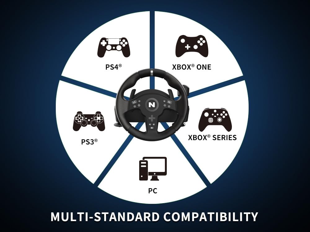 • ОПТИМИЗИРАНО ЗАВЪРТЕНЕ НА ВОЛАНА - Въртенето от 270 градуса до спиране ви позволява да играете различни състезателни игри на PlayStation 4, Xbox (всички версии и серии) и PC (X вход и D вход). Системата против обратен ход осигурява стабилна производителност и предотвратява клатушкане по време на агресивни маневри.