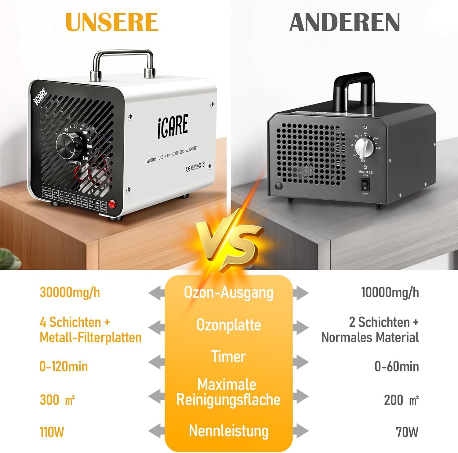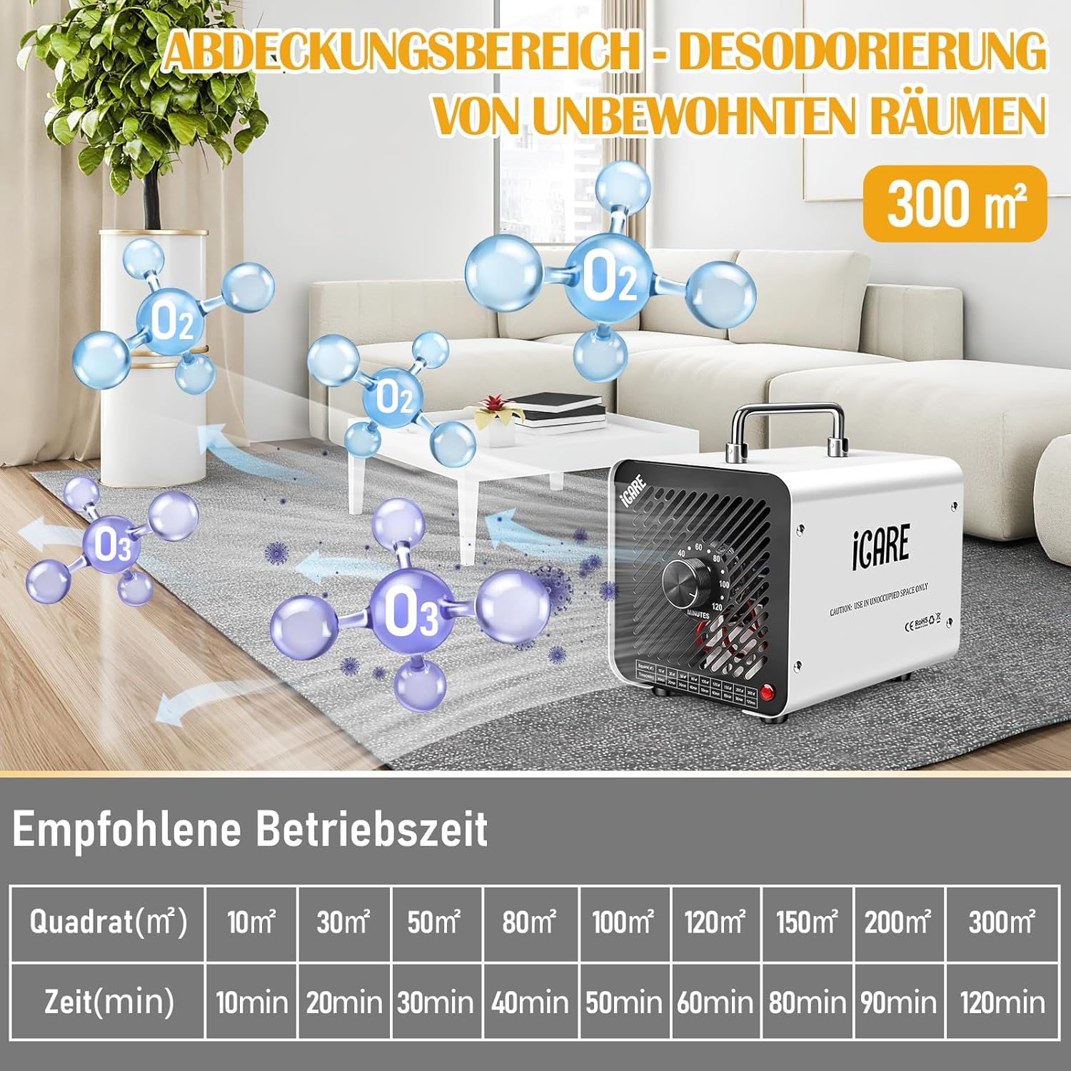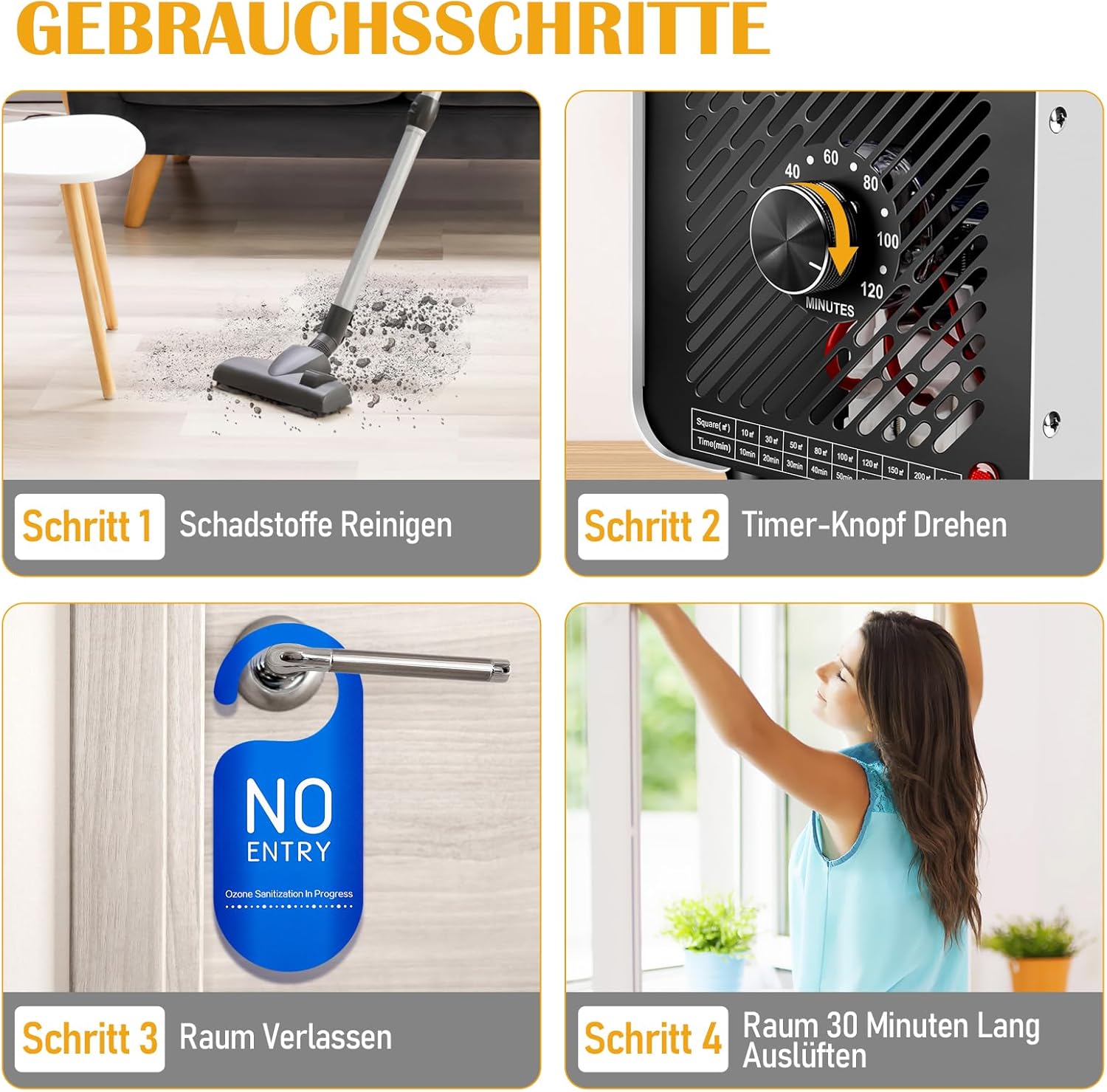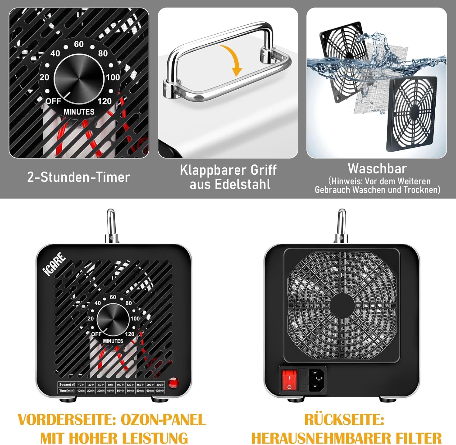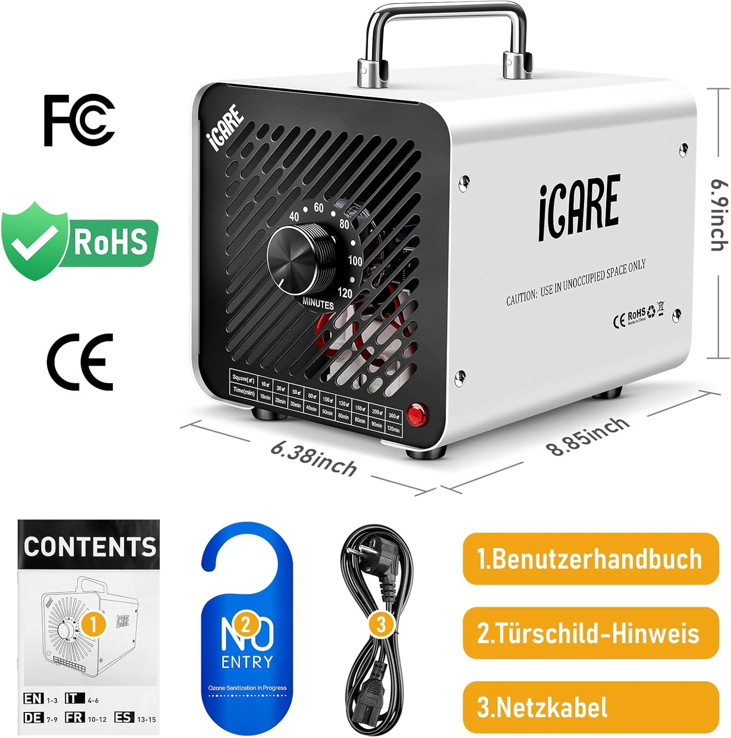 • Озонатор Стабилен, здрав и преносим: корпусът от неръждаема стомана осигурява дълъг експлоатационен живот на озонатора. Неплъзгащите се крачета гарантират стабилна стойка във всеки дом. Компактни размери, с компактните си размери от 215 x 163 x 160 мм, озоновият генератор може лесно да се постави във всяка стая. Идеален като пречиствател на въздух за кола или дома.