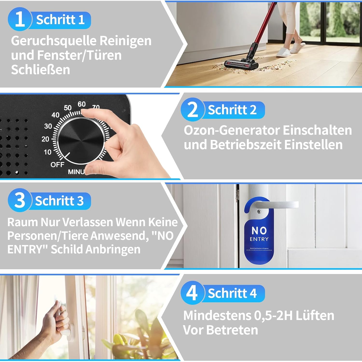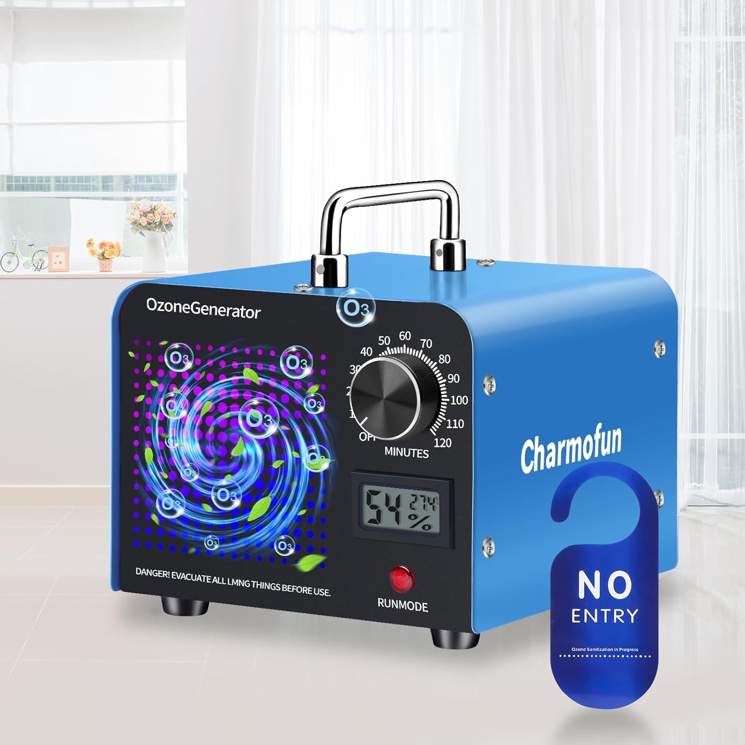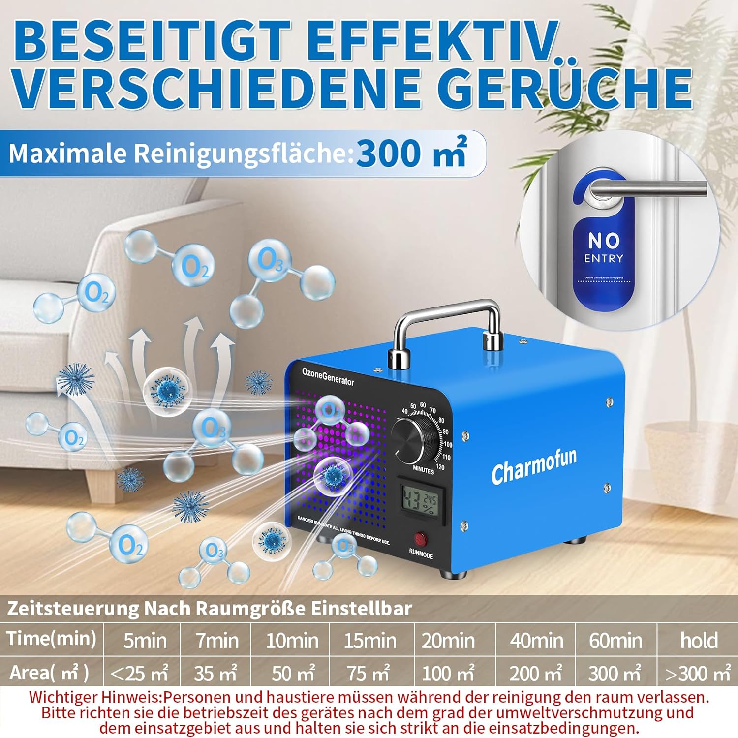 • Внимание: В стаята няма хора или животни, когато озоновият генератор работи. Изчакайте поне 30-120 минути, след като озонаторът е спрял да произвежда озон, преди да влезете в стаята, и след това отворете вратите и прозорците, за да проветрите стаята. (Ако след 2 часа все още има осезаема миризма, моля, удължете времето за проветряване.)