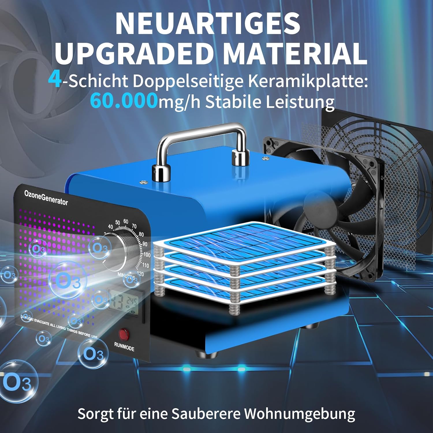 Генератор на озон 60 000 мг/ч озоново устройство, индустриален генератор на озон с дисплей за температура и влажност, 120-минутен таймер, O3 озонов пречиствател на въздух за кола, дом, кухня, домашни любимци (син)