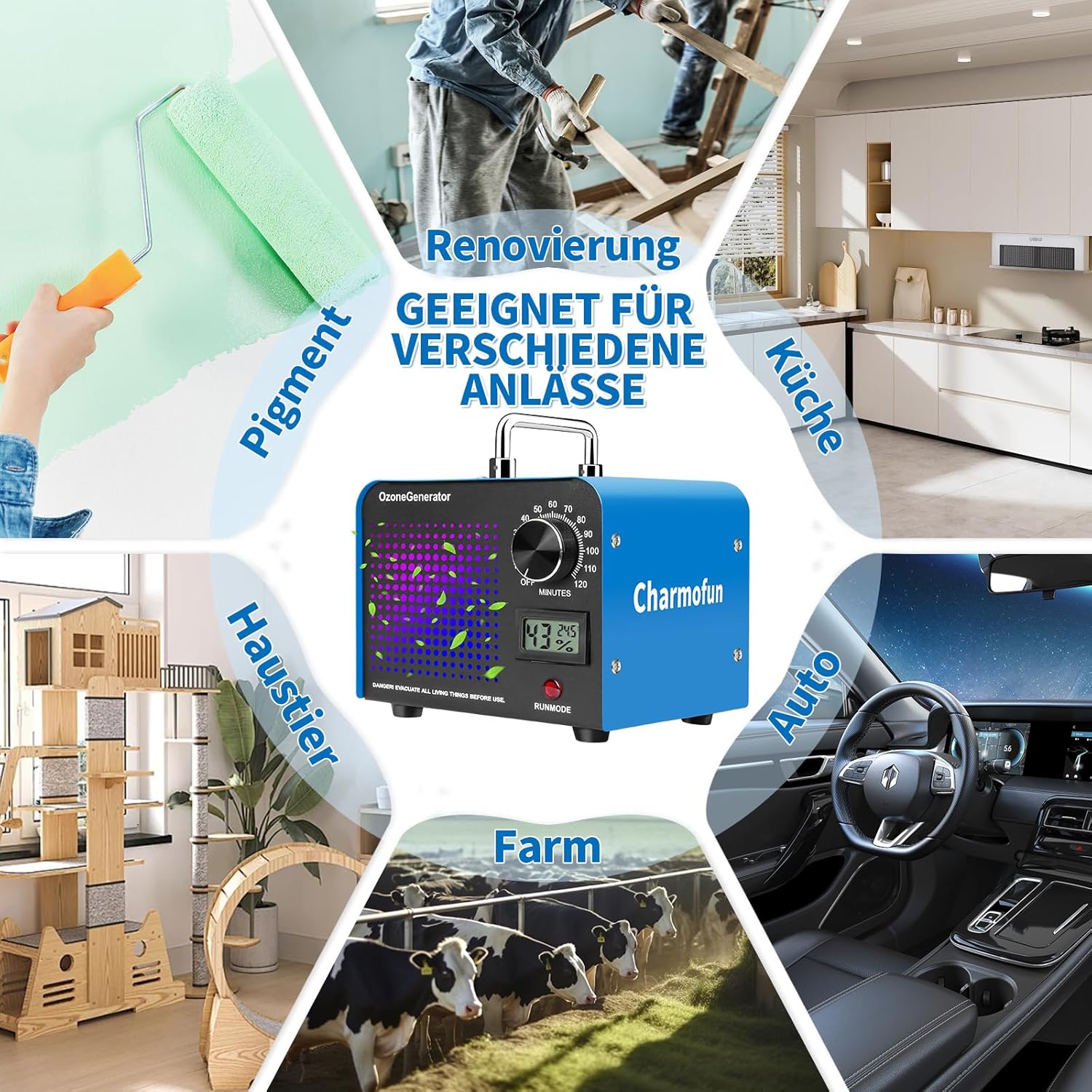 • Подходящ за много случаи: озоновият генератор е много подходящ за различни помещения. Независимо дали сте в дома си, офиса, зоната за домашни любимци, мазето или дори в колата си, озоновият пречиствател на въздух O3 може да елиминира миризми от дим, домашни любимци, кола, готвене и други от тези помещения и да създаде чиста и комфортна среда за живот за вас.
