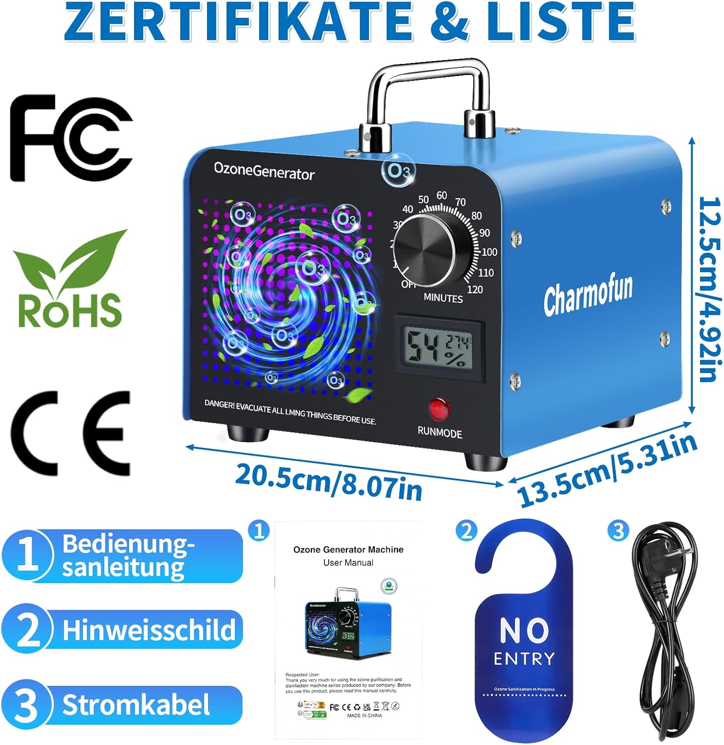 • Високоефективен озонов генератор: Нашият озонов генератор може да произвежда 60 000 мг озон на час, с площ на почистване до 300 м² и ефективност на почистване до 99%. Той бързо премахва всички видове миризми, като дим, кухненски миризми, миризми на домашни любимци и други миризми, като по този начин осигурява по-приятна среда за живот.