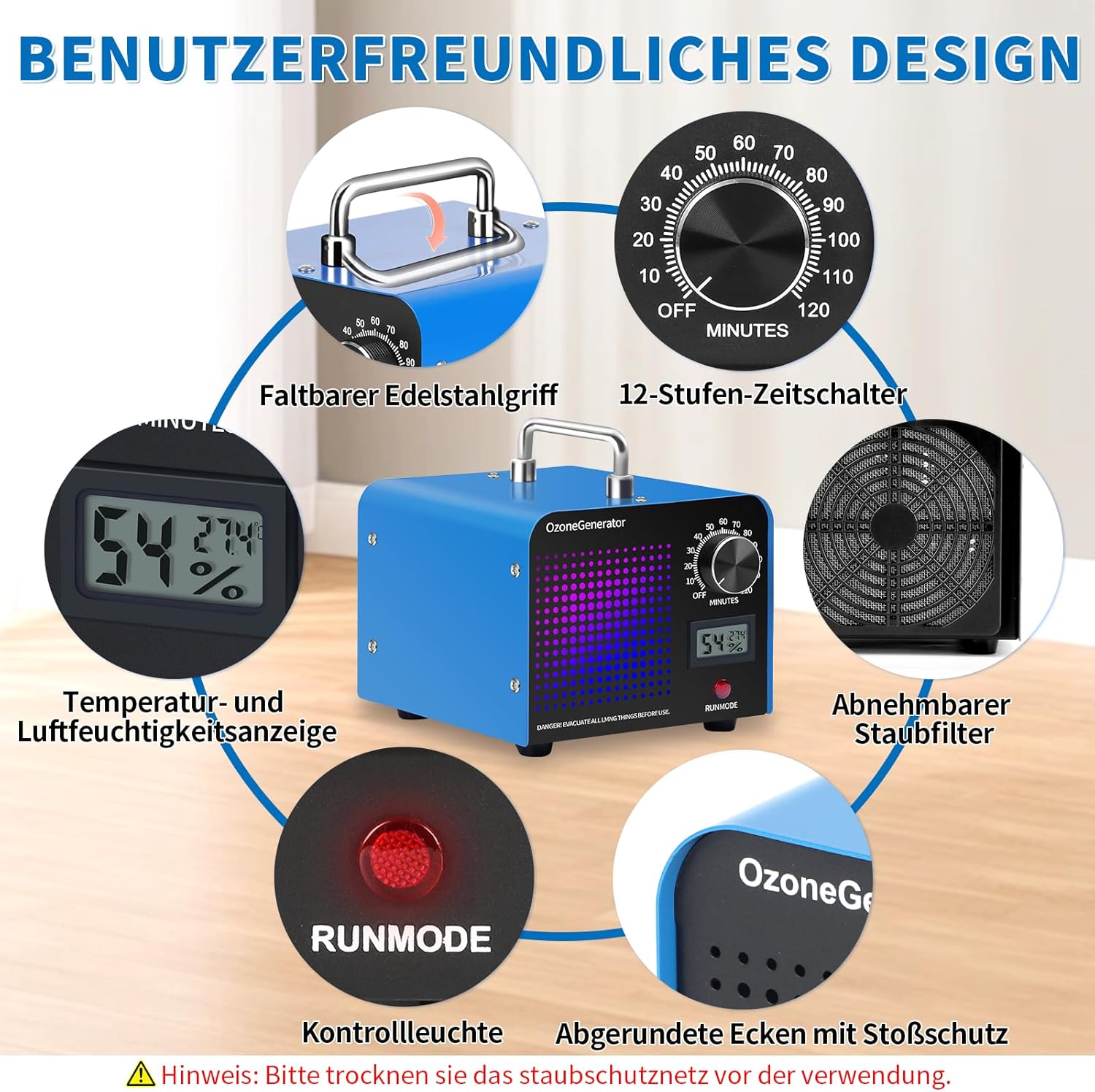 • 120-минутен таймер: Озонаторът е оборудван с таймер, който ви позволява да настроите времето за работа до 2 часа (изключва се автоматично, когато зададеното време е достигнато). Настройте времето за работа на устройството според степента на замърсяване на околната среда и размера на помещението и стриктно следвайте инструкциите за употреба. Озонаторът работи при шум под 45 dB и не причинява смущения.