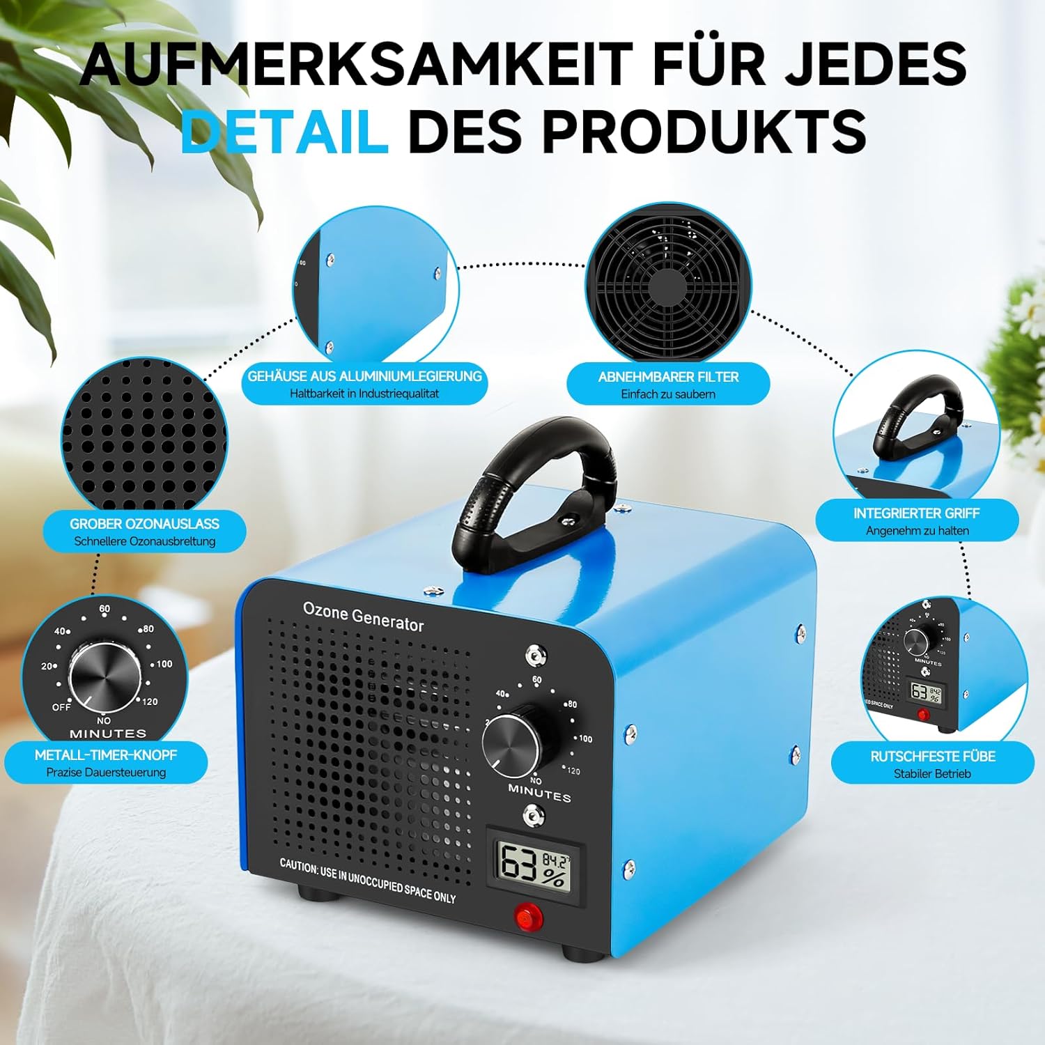 • Ефективен озонов генератор с мощност 60 000 мг/ч: с производство на озон от 60 000 мг/ч, този озонов генератор е най-мощният. Той използва собствен мощен вентилатор, за да разпредели бързо озона в помещението, реагира със замърсителите и бързо ги превръща в свеж кислород. Поглезете себе си и семейството си с дом, изпълнен с естествена атмосфера.