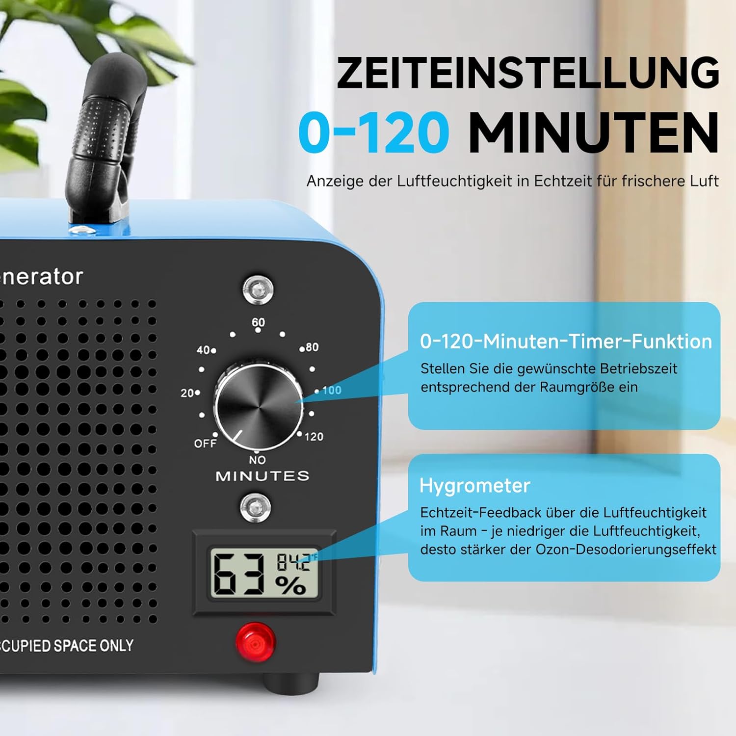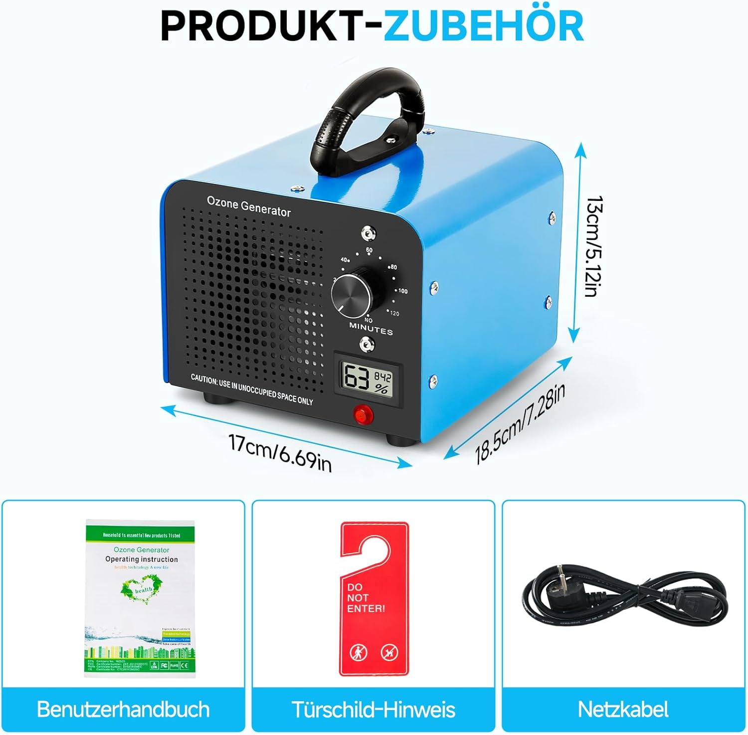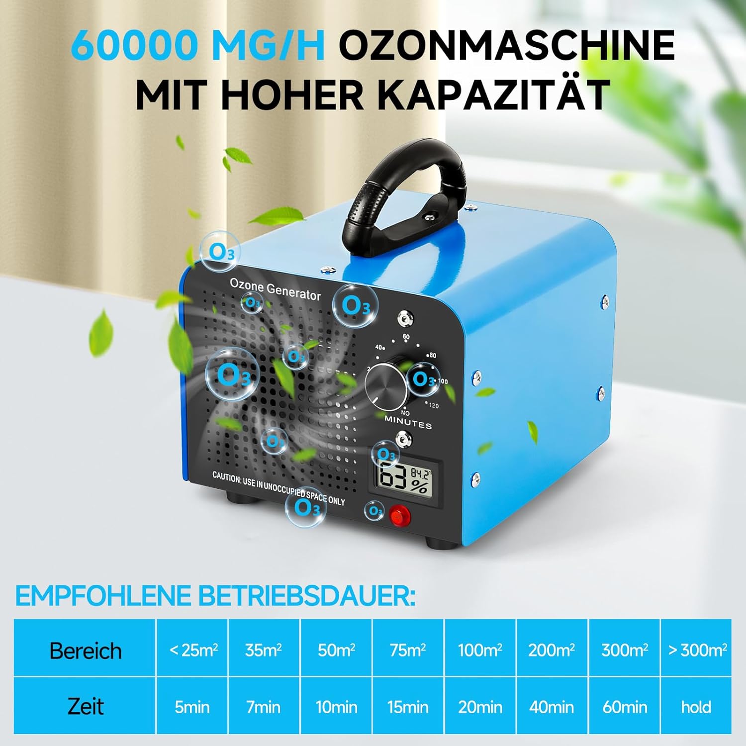 Генератор на озон, 60 000 мг/ч озоново устройство с дисплей за температура и влажност, O3 озонов пречиствател на въздух със 120-минутен таймер за 320㎡, за кола, дом, дим, миризма на домашни любимци, миризма на кухня, син