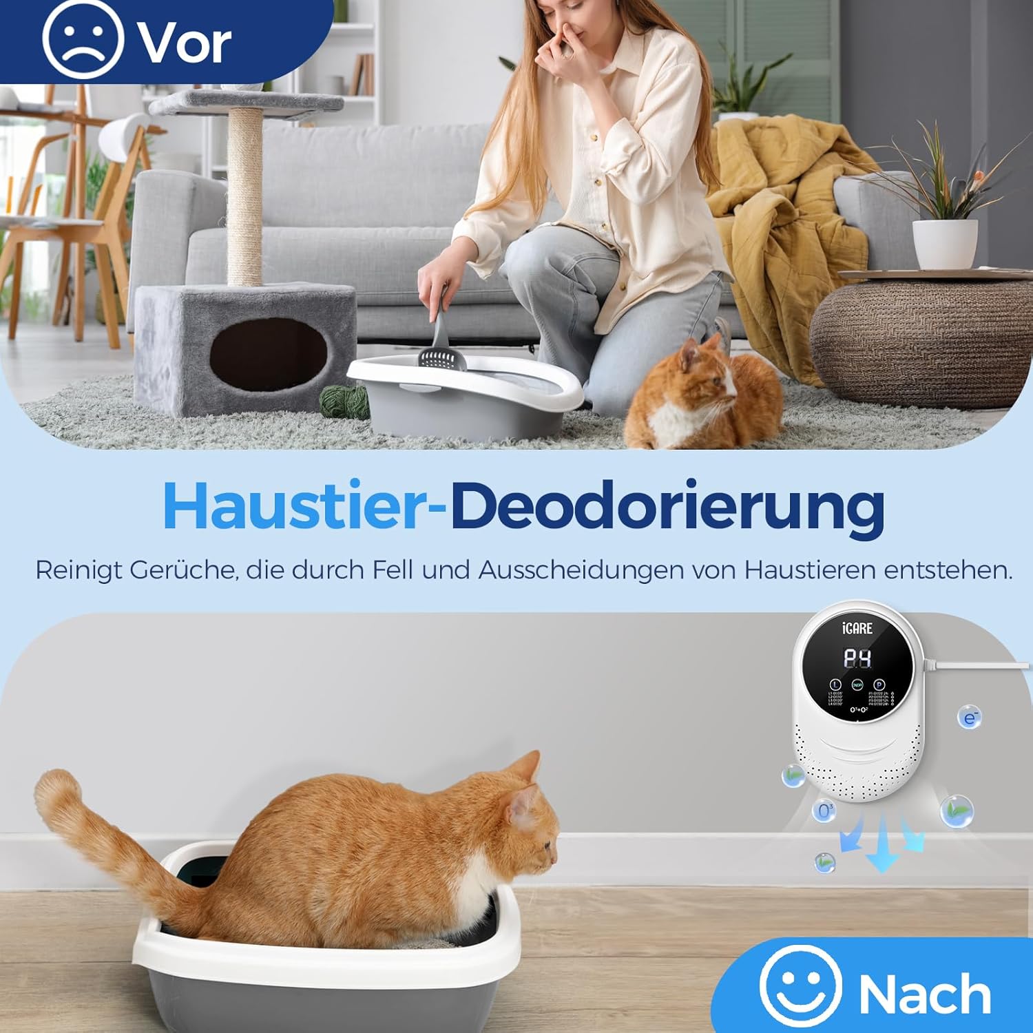 • Бърза дезодорация: Пречиствател на въздух с активен кислороден поток от 300 мг/ч, професионална бърза дезодорация. Може да премахне специфичната миризма на банята, специфичния мирис на домашни любимци, кухненските изпарения, миризмата на дим, дезинфекцира и декорира нова къща, за да премахне формалдехида и да почисти въздуха. Може да се използва за опазване на вашата жизнена среда.