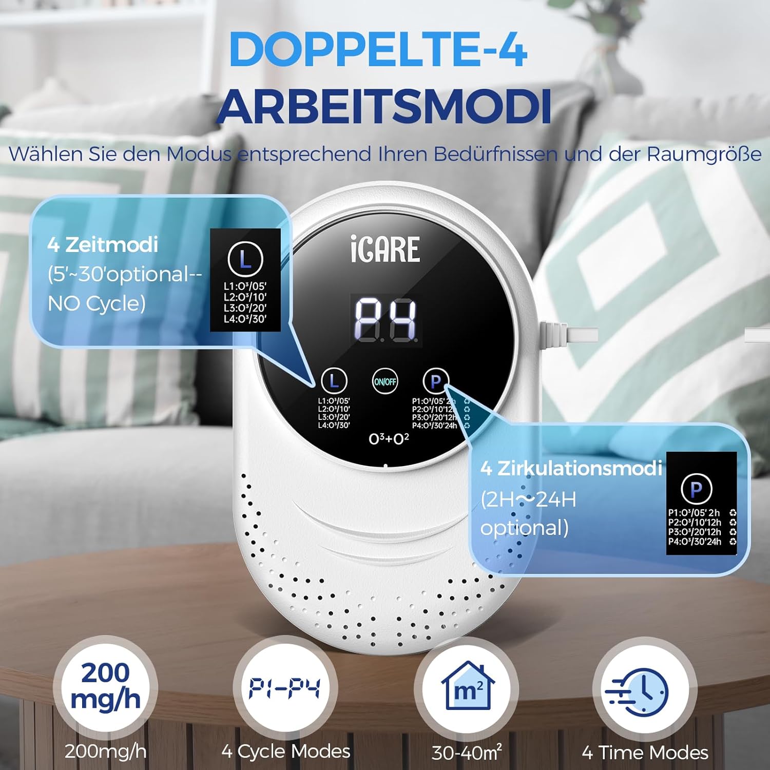 • Област на употреба и 4 режима: Генератор на озон, подходящ за почистване на помещения с площ 5-30㎡. Можете да регулирате според размера на помещението си. Включете устройството, натиснете бутона "Вкл./Изкл.", включете и изключете устройството, индикаторът за режим мига, за да покаже, че устройството работи, и ако индикаторът за режим свети постоянно, това е състояние на готовност на устройството. Натиснете бутона "Режим", когато е включено, за да изберете режим на цикъл P1, P2, P3, P4.