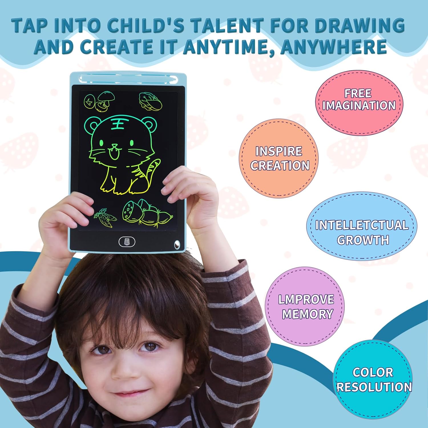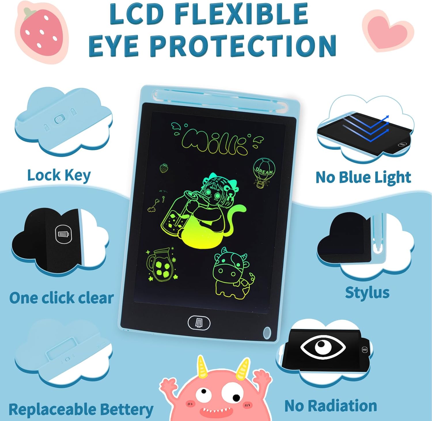 • Образователни играчки за деца: LCD таблет за рисуване с цветен дисплей, много ясно писане, осигурява достатъчно място за рисуване и графити, отприщва детското въображение и стимулира креативността им. LCD дисплеят няма синя светлина, отблясъци или радиация и предпазва детските очи от увреждане в резултат на продължителна употреба. Той е добър партньор за децата.