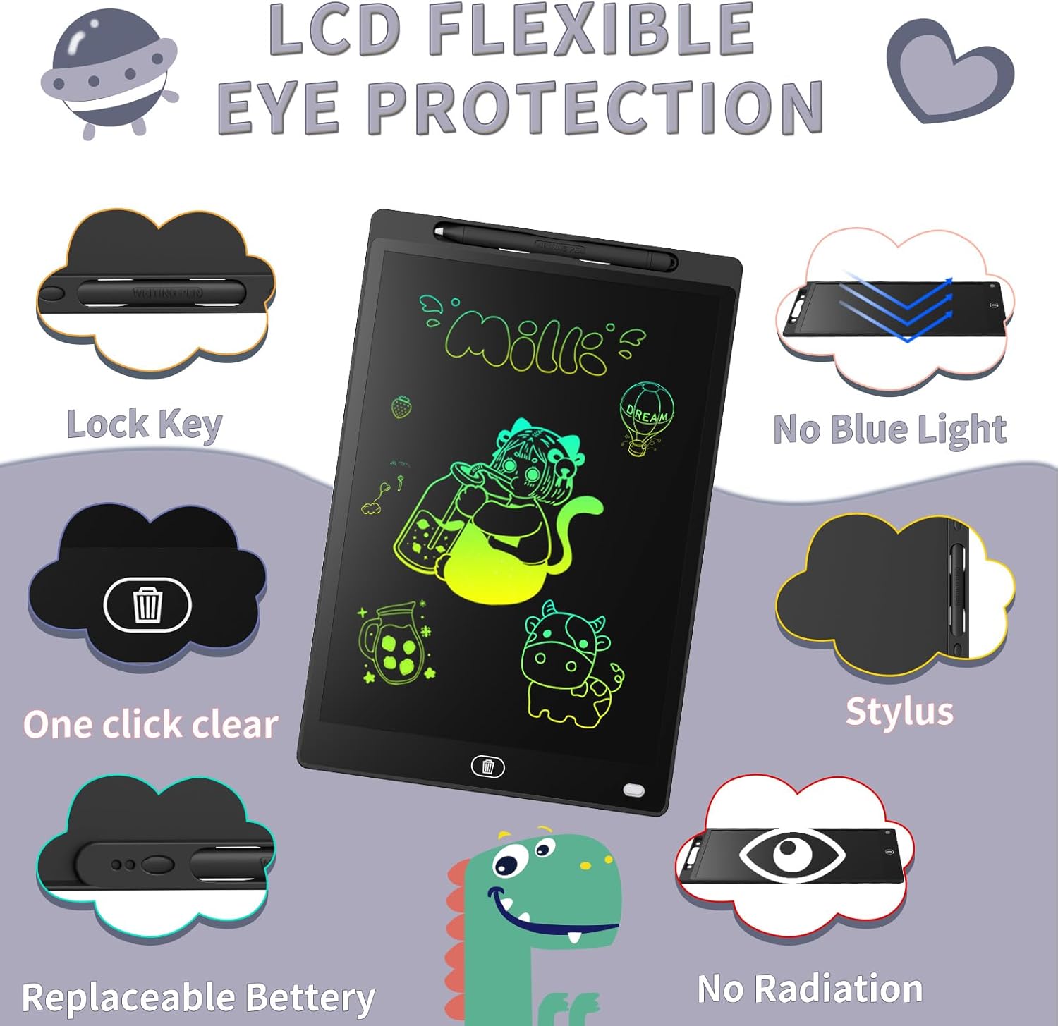 • Образователни играчки за деца: LCD таблет за рисуване с цветен дисплей, много ясно писане, осигурява достатъчно място за рисуване и графити, отприщва детското въображение и стимулира креативността им. LCD дисплеят няма синя светлина, отблясъци или радиация и предпазва детските очи от увреждане в резултат на продължителна употреба. Той е добър партньор за децата.