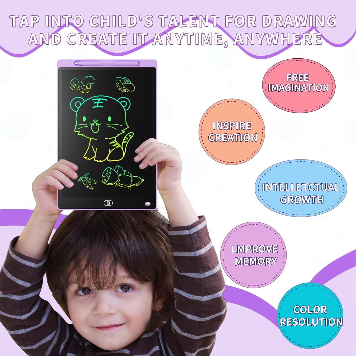 • Образователни играчки за деца: LCD таблет за рисуване с цветен дисплей, много ясно писане, осигурява достатъчно място за рисуване и графити, отприщва детското въображение и стимулира креативността им. LCD дисплеят няма синя светлина, отблясъци или радиация и предпазва детските очи от увреждане в резултат на продължителна употреба. Той е добър партньор за децата.