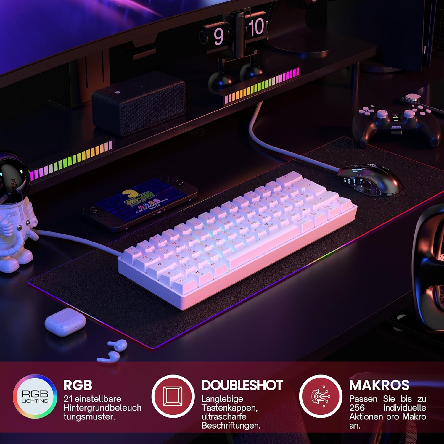 GK61 Механична геймърска клавиатура с възможност за бърза смяна - 62 клавиша, многоцветна RGB LED подсветка за PC/Mac плейъри - ISO немско оформление (Gateron Optical черно, бяло)