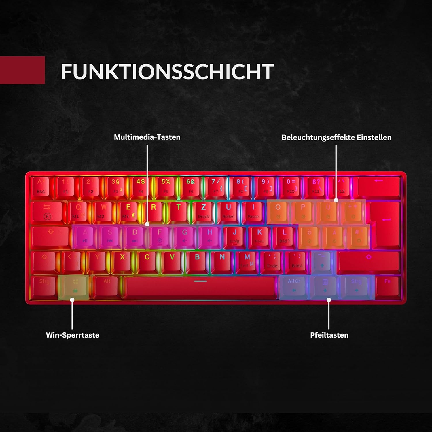 GK61 Механична геймърска клавиатура с възможност за бърза смяна - 62 клавиша, многоцветна RGB LED подсветка за PC/Mac плейъри - ISO немско оформление (Gateron Optical, кафяво, червено)