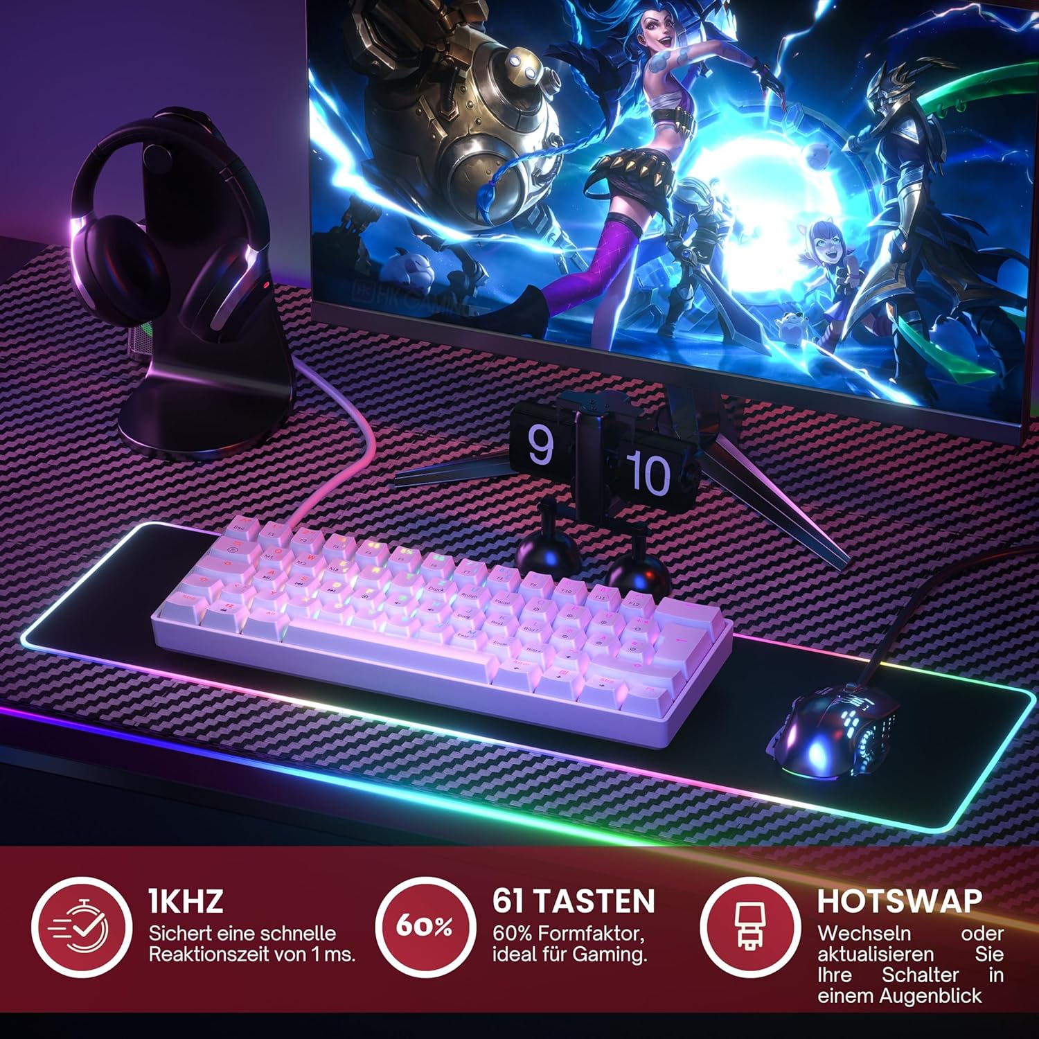 GK61 Механична геймърска клавиатура с възможност за бърза смяна - 62 клавиша, многоцветна RGB LED подсветка за PC/Mac плейъри - ISO немско оформление (Gateron Optical синьо, бяло)