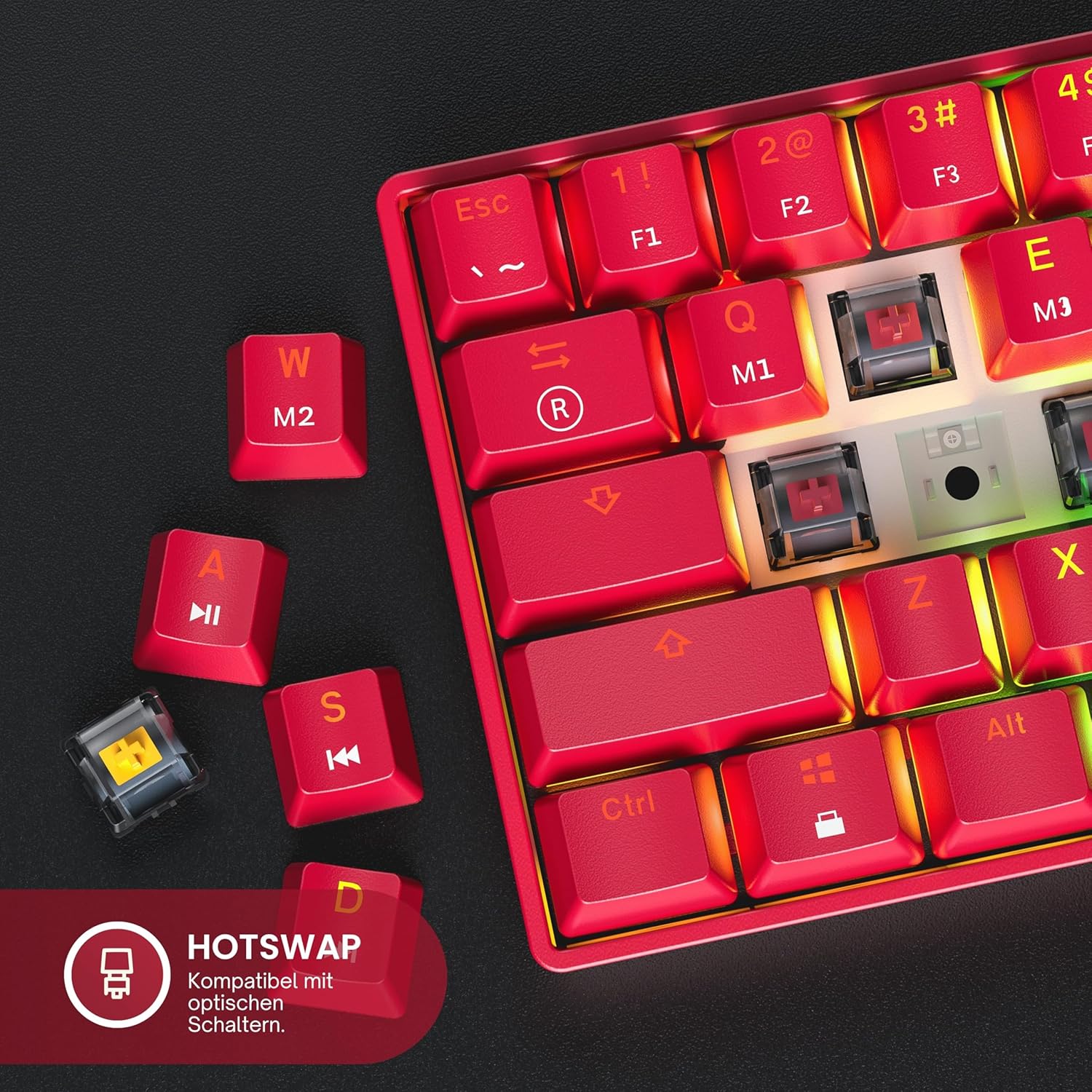 GK61 Механична геймърска клавиатура с възможност за бърза смяна - 62 клавиша, многоцветна RGB LED подсветка за PC/Mac плейъри - ISO немско оформление (Gateron оптична червена, червена)