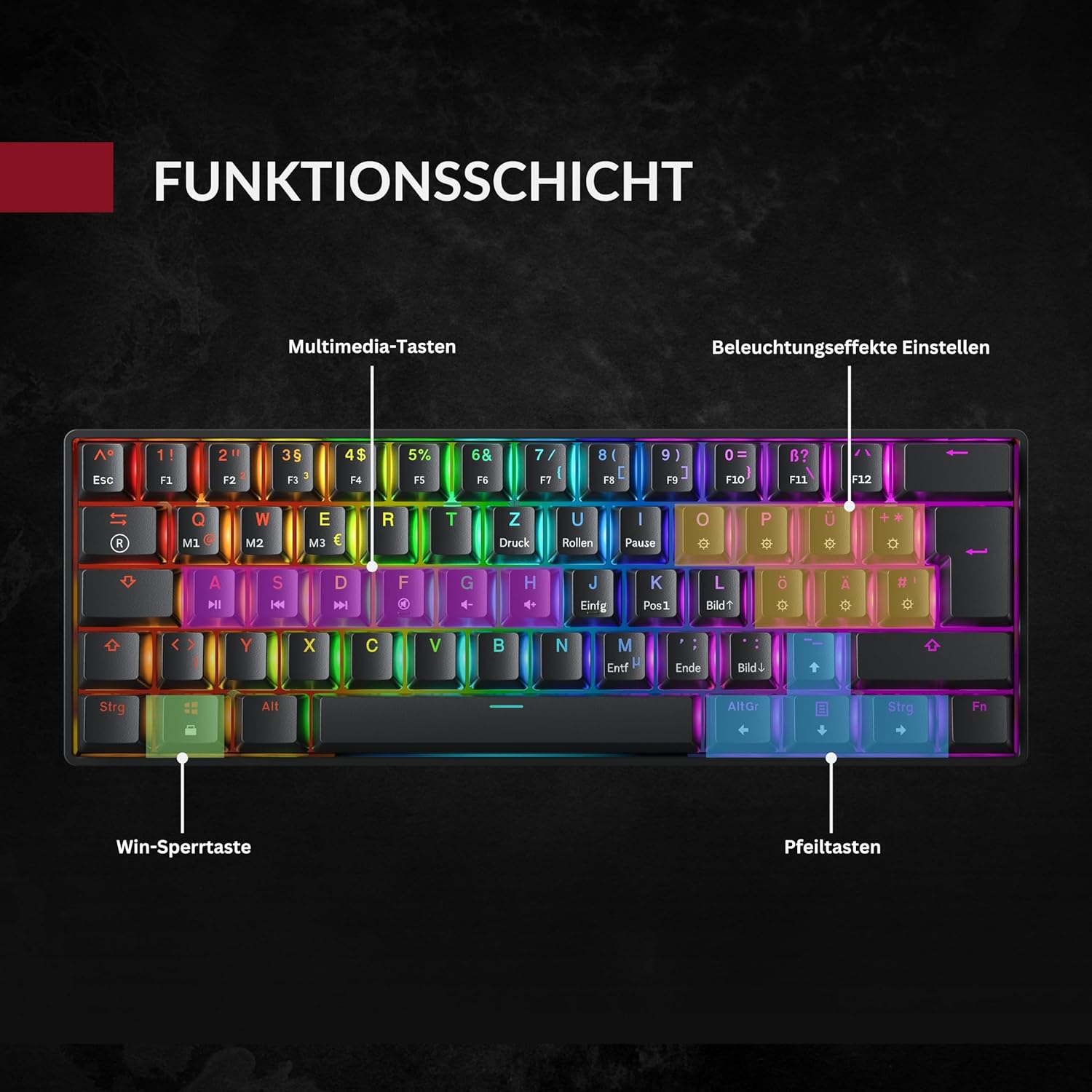 GK61 Механична геймърска клавиатура с възможност за бърза смяна - 62 клавиша, многоцветна RGB LED подсветка за PC/Mac плейъри, тактилна - ISO немско оформление (Gateron Optical Brown)