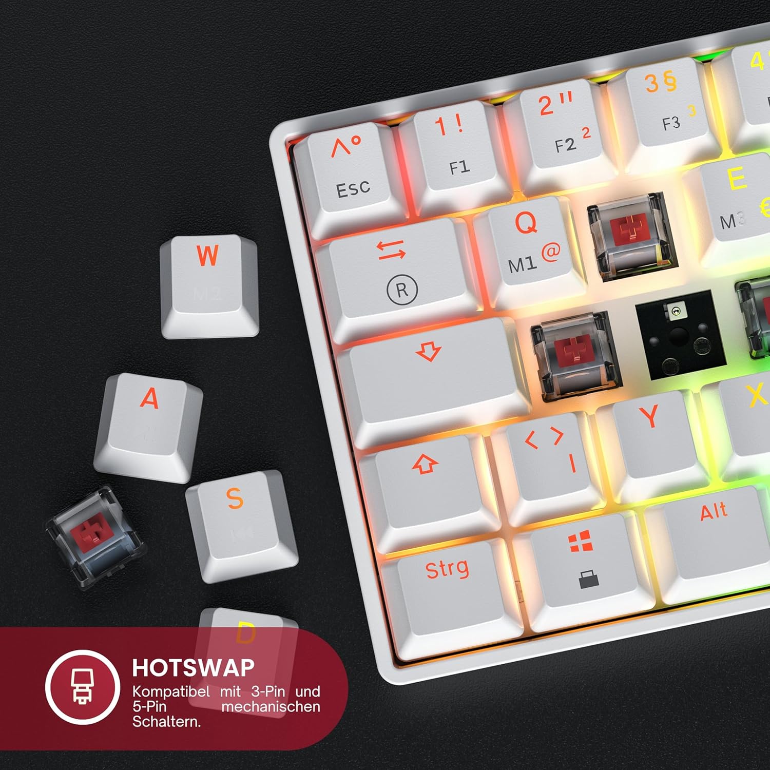 GK61 s Hot-Swap механична геймърска клавиатура - 62 клавиша, многоцветна RGB LED подсветка за PC/Mac плейъри - ISO немско оформление (Gateron механична синя, бяла)