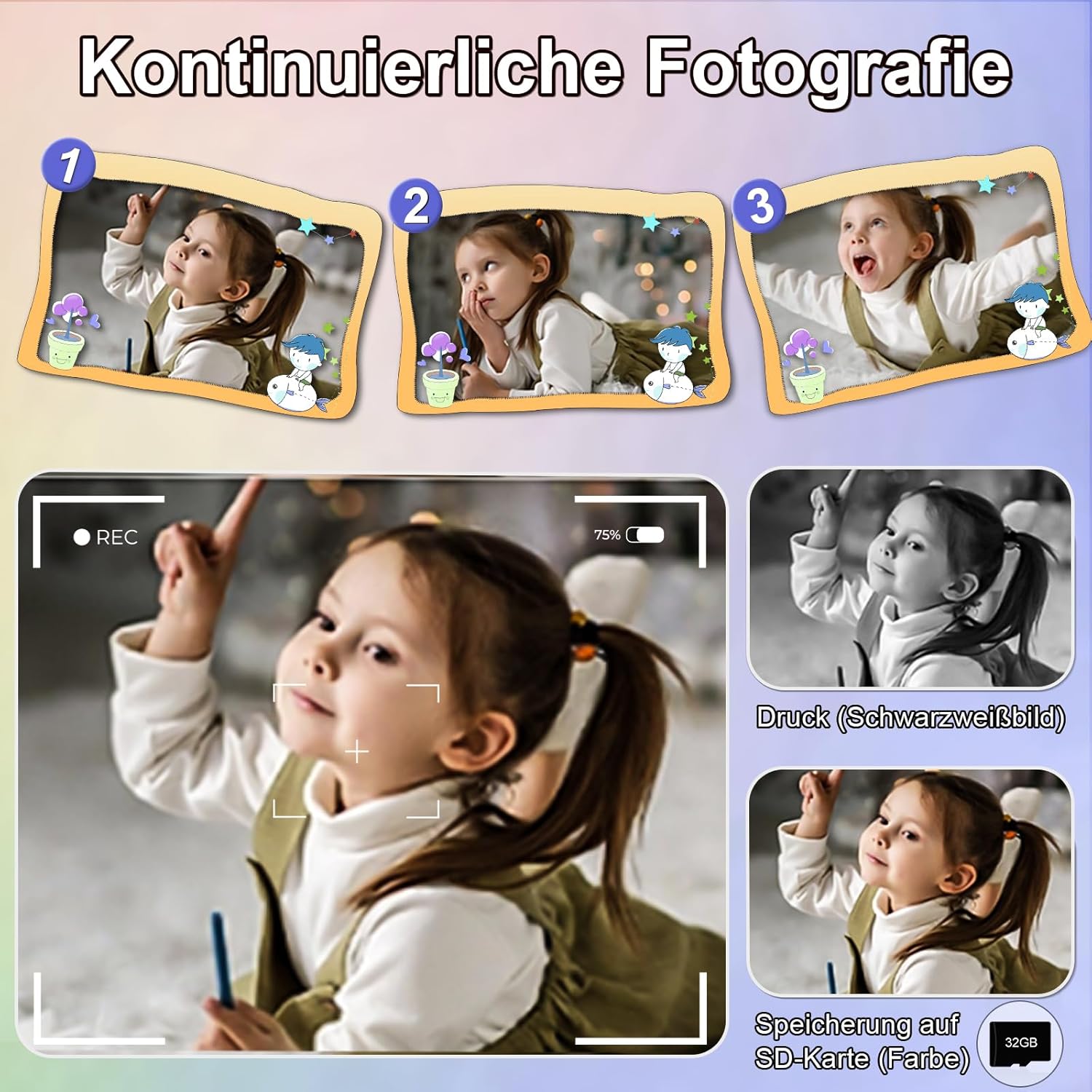 • Многофункционален детски фотоапарат: мини фотоапарат за моментално принтиране за деца, 2.4-инчов голям екран, 1080P HD видео, 16x цифрово увеличение, светкавица, time-lapse фотография, непрекъснато заснемане, игри, филтър, рамка за снимки, MP3, множество функции за задоволяване на деца с различни нужди. Това е добър избор да придружите децата си, за да растат щастливи. Запишете красиви моменти със семейството си.