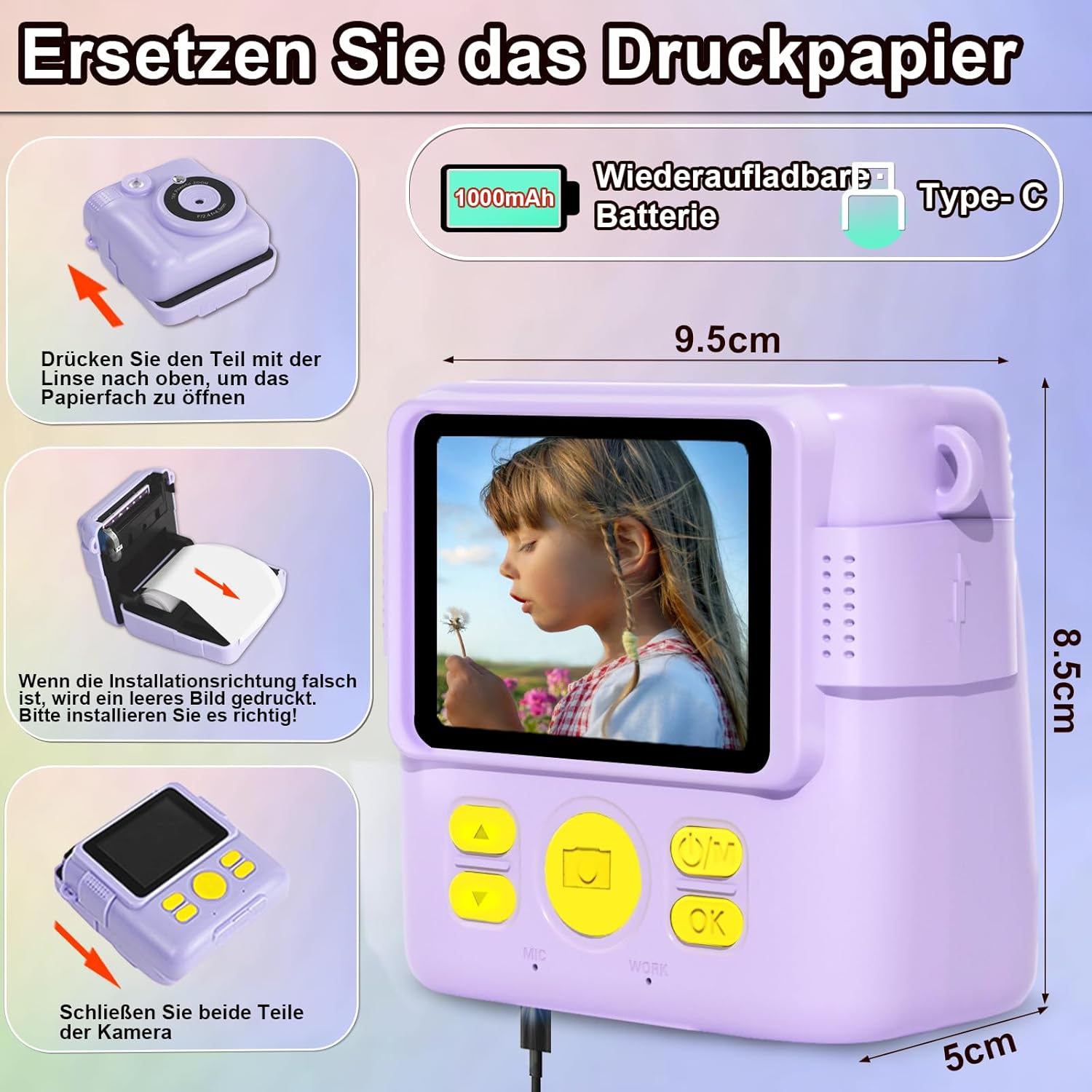 GKTZ Детски фотоапарат за моментално снимане - 1080P HD моментално отпечатване на снимки - Подарък за рожден ден за момичета на възраст 5, 6, 7, 8, 9 и 10 години (лилав)