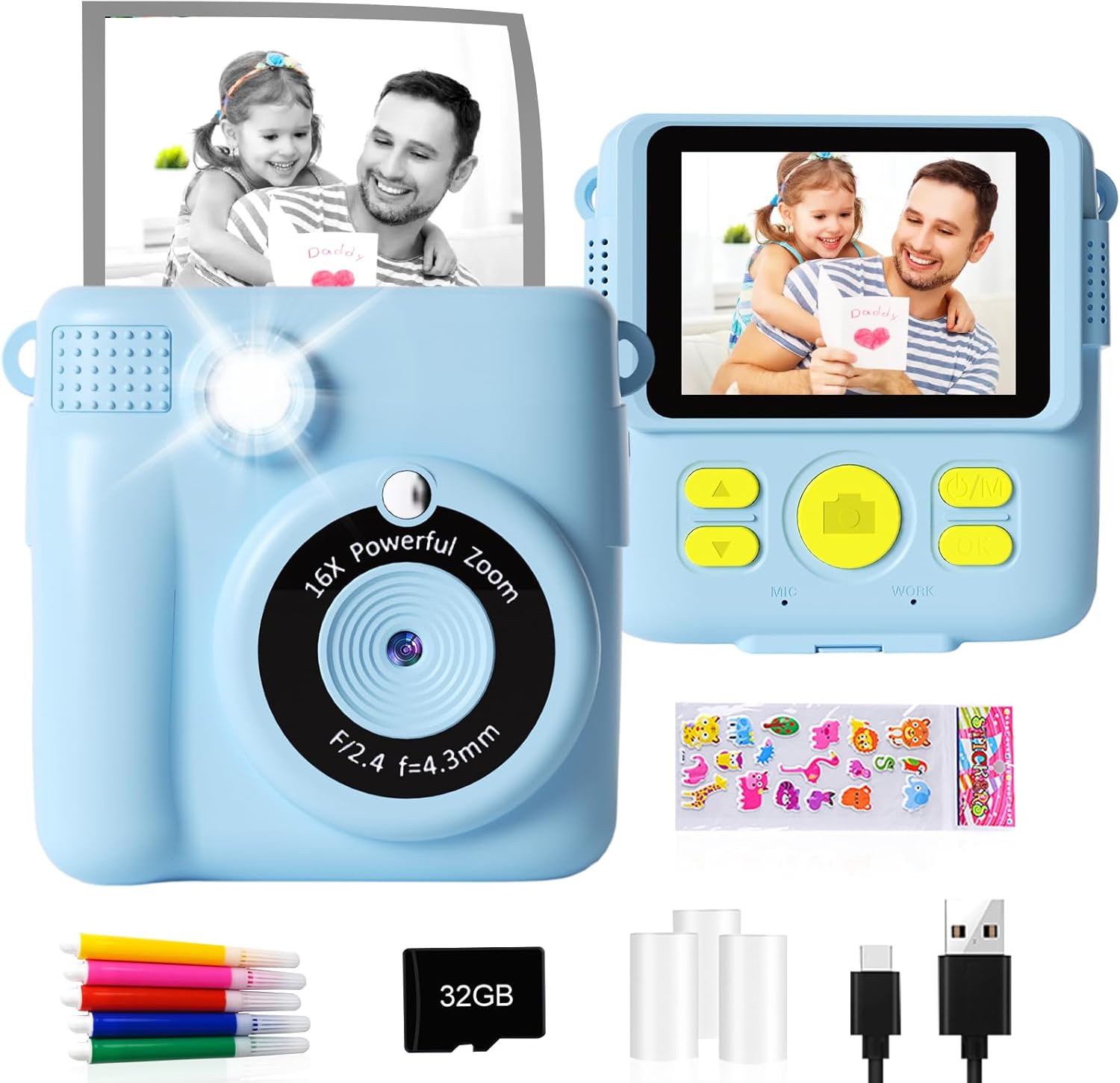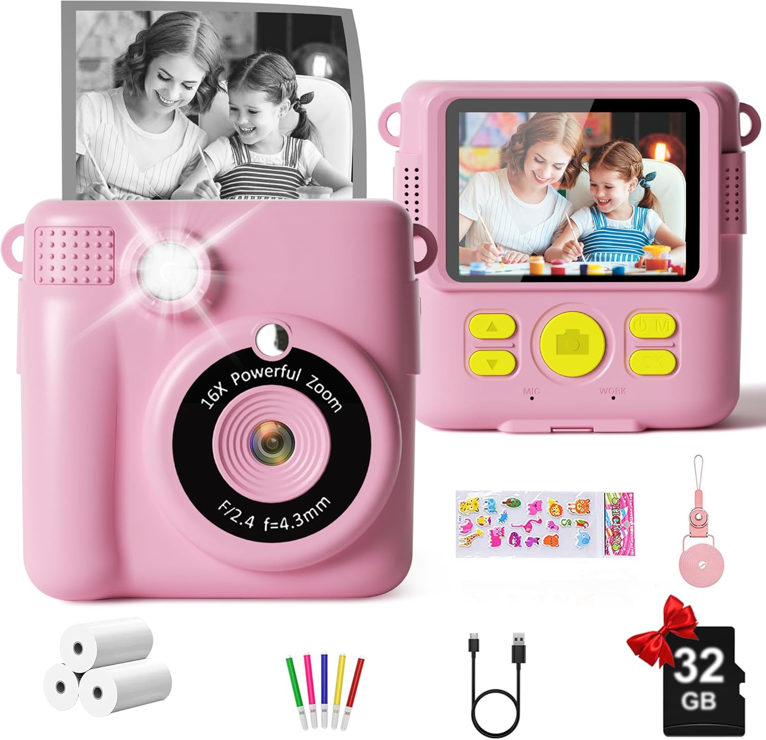 • Многофункционален детски фотоапарат: мини фотоапарат за моментално принтиране за деца, 2.4-инчов голям екран, 1080P HD видео, 16x цифрово увеличение, светкавица, time-lapse фотография, непрекъснато заснемане, игри, филтър, рамка за снимки, MP3, множество функции за задоволяване на деца с различни нужди. Това е добър избор да придружите децата си, за да растат щастливи. Запишете красиви моменти със семейството си.