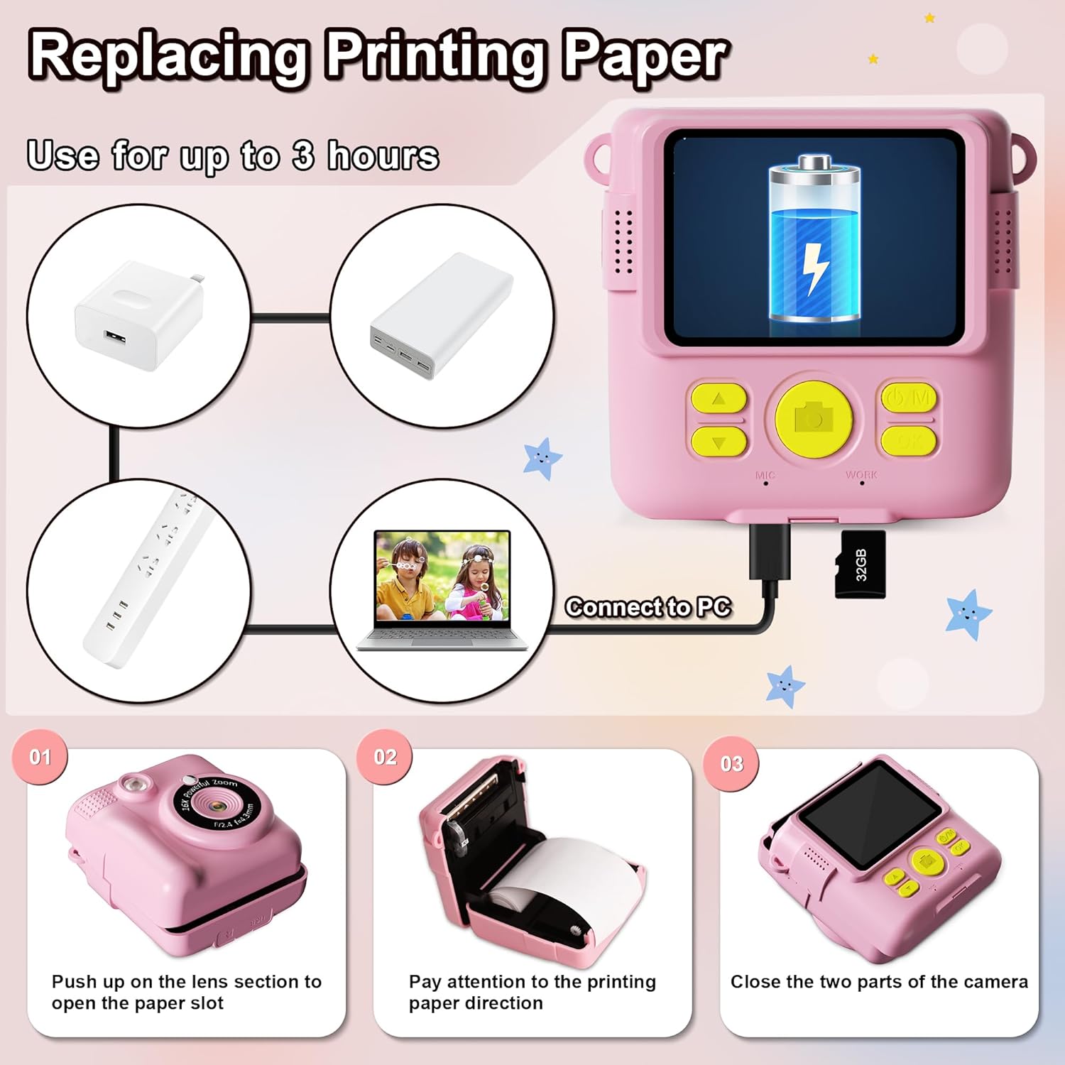 • Преносим детски фотоапарат: Този фотоапарат за печат има вградена батерия от 1000 mAh, която поддържа около 3 часа непрекъсната фотография след пълно зареждане. Зареждането чрез USB тип C е много удобно за деца, които са в движение. Освен това, нашият мини цифров фотоапарат се предлага с връзка за лесно пренасяне, така че децата лесно могат да следят живота си.