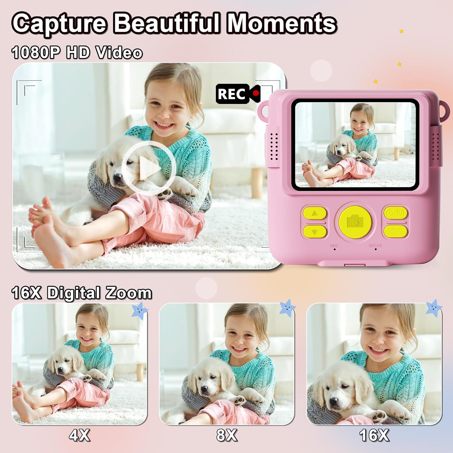GKTZ Детски фотоапарати за моментално снимане - 1080P HD моментално отпечатване на снимки - Подарък за рожден ден за момичета на възраст 5, 6, 7, 8, 9 и 10 години (розови)