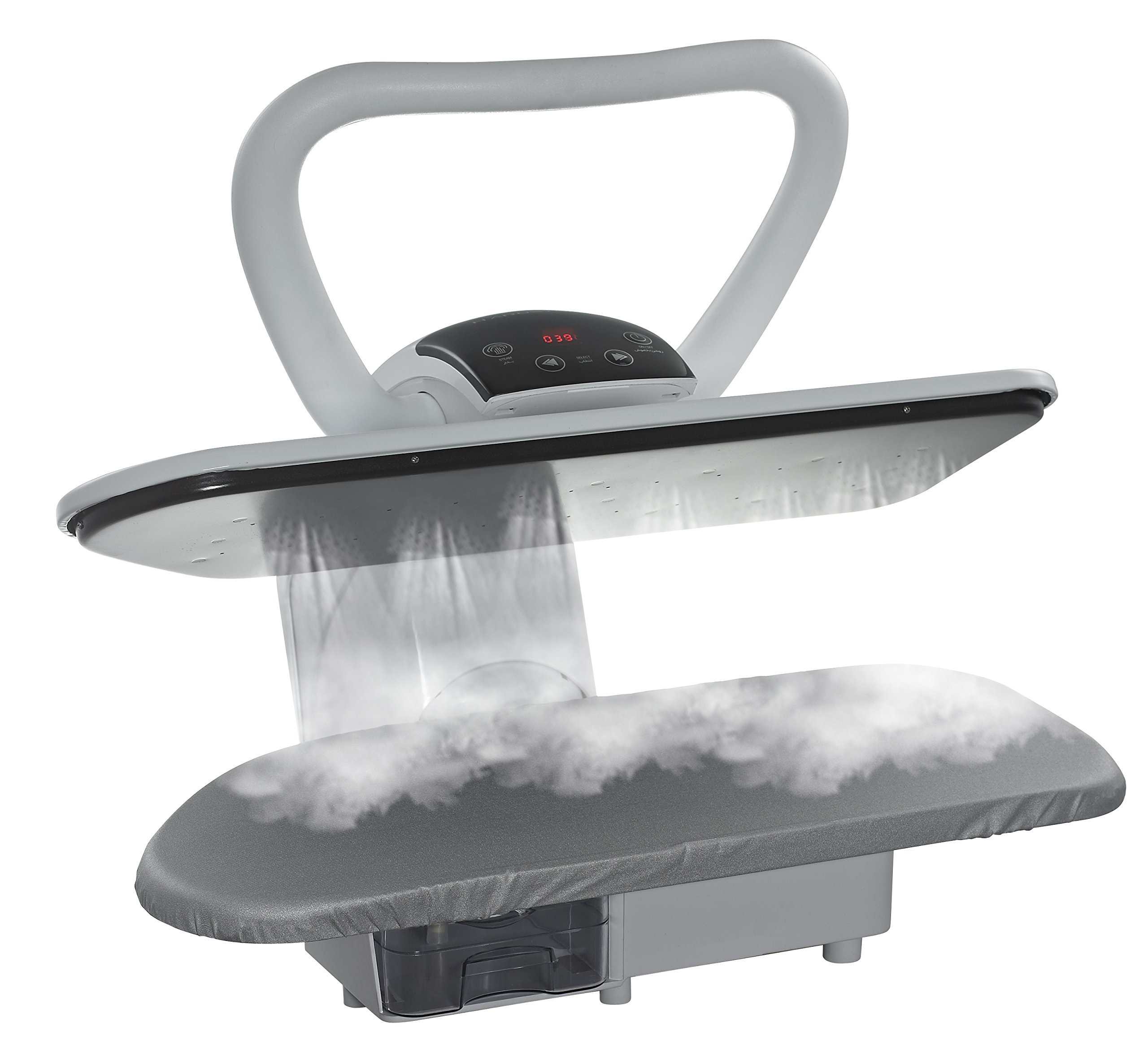 - Може да се използва като тотална суха преса или с автоматична пара. Когато е натиснат надолу, това съответства на 46 kg налягане (или 23 гр на кубичен метър). Функция за пара: мощна изходна пара от 90 гр на минута и усилваща изходна пара от 120 гр на минута без капене на вода. Лесен за носене и съхранение.