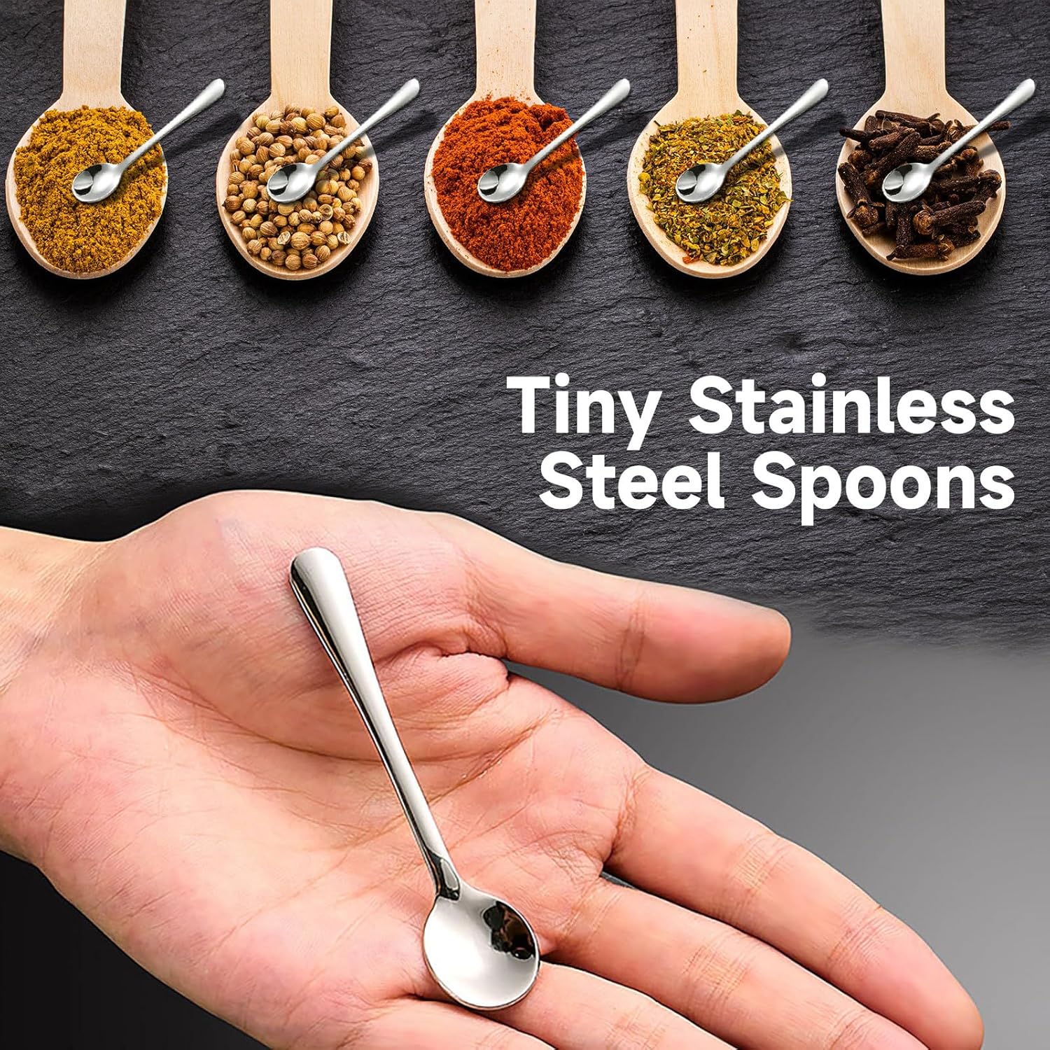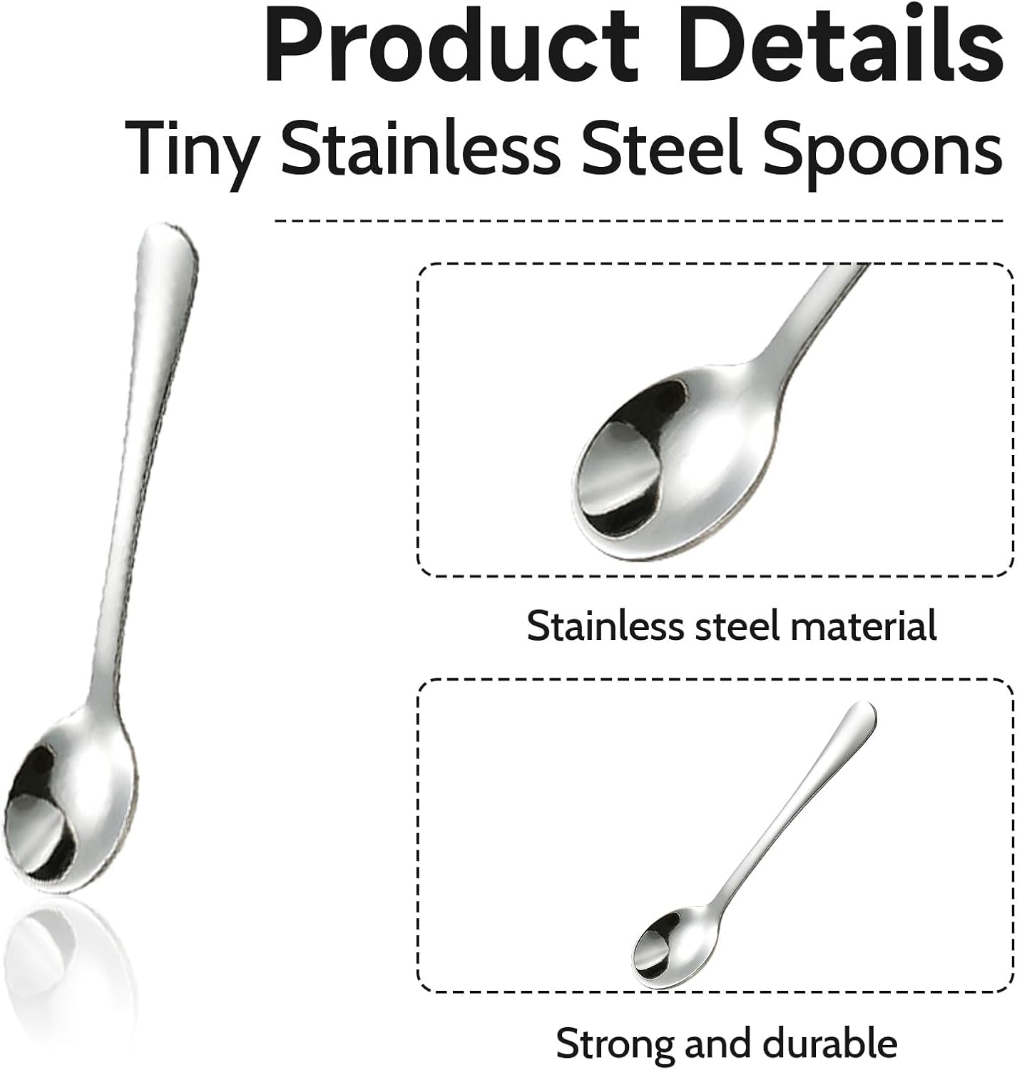 1. Много малък размер: 7,5 см дължина, 1,6 см ширина. Тези малки лъжички от неръждаема стомана са леки, но здрави. За многократна употреба и издръжливи.