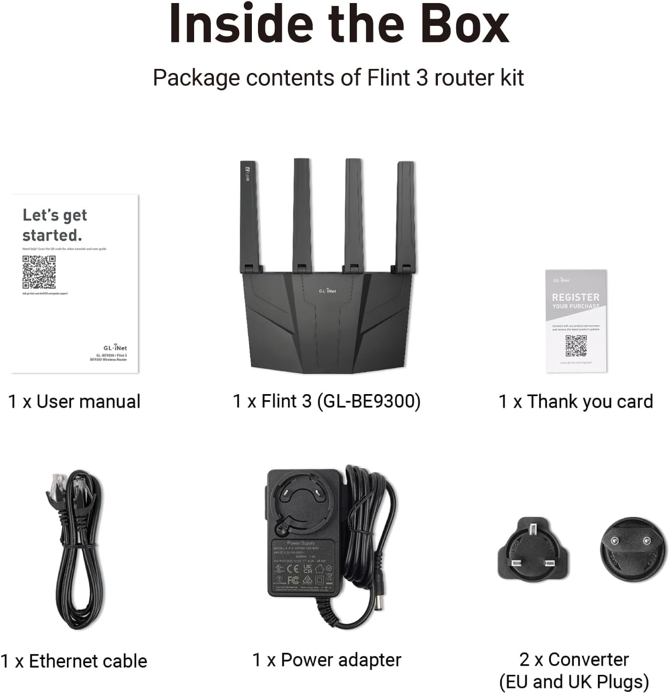 GL.iNet GL-BE9300(Flint 3) Трибандов WLAN рутер, WiFi 7 рутер, Геймърски рутери за оптичен модем, 5 x 2.5G порта, 6 GHz, VPN безжичен интернет компютърни рутери, за дома и бизнеса