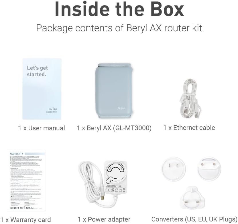 GL.iNet GL-MT3000 (Beryl AX) Мобилен рутер за пътуване, WiFi 6 рутер, VPN мобилен WLAN рутер, джобен WiFi, 2.5G Gigacube порт, WLAN точка за достъп за пътуване с оптичен модем, Openwrt/Wireguard/Home