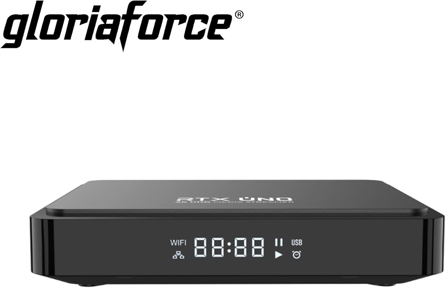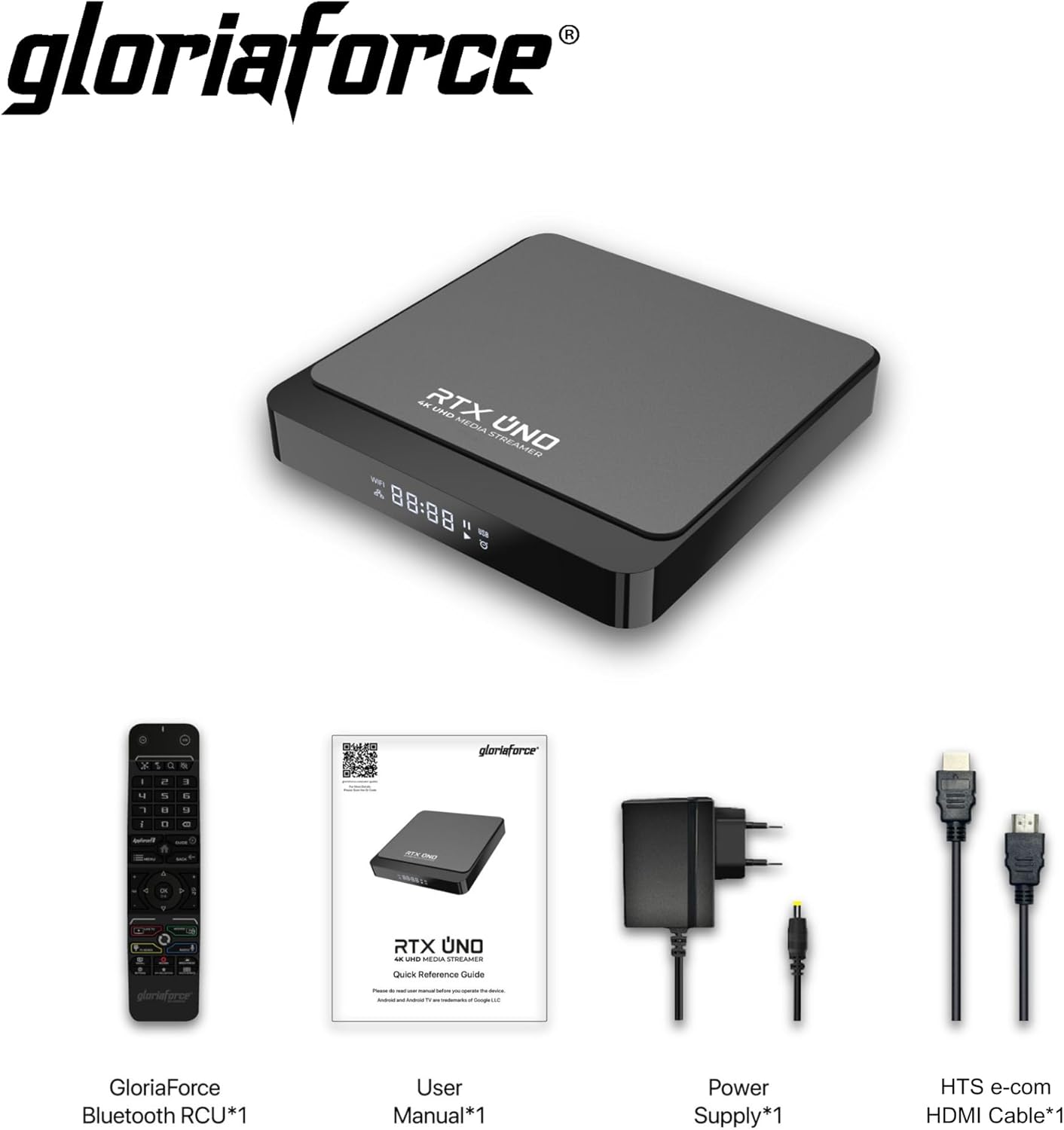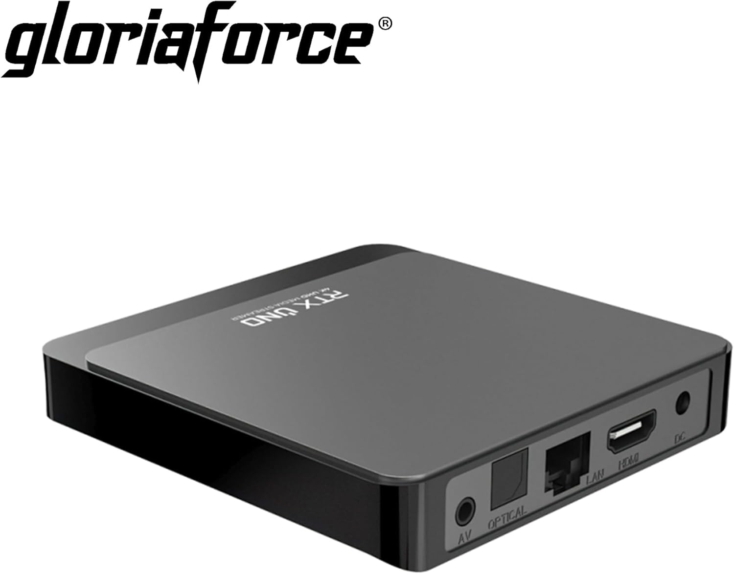 GloriaForce RTX UNO 4K UHD Android 11.0 TV Box 2GB RAM, 16GB Flash, 1GBps LAN, 5G WiFi, App Force II, S905X4 Quad Core ARM Cortex A55, ARM G31 GPU, BT дистанционно управление, HTS e-com HDMI