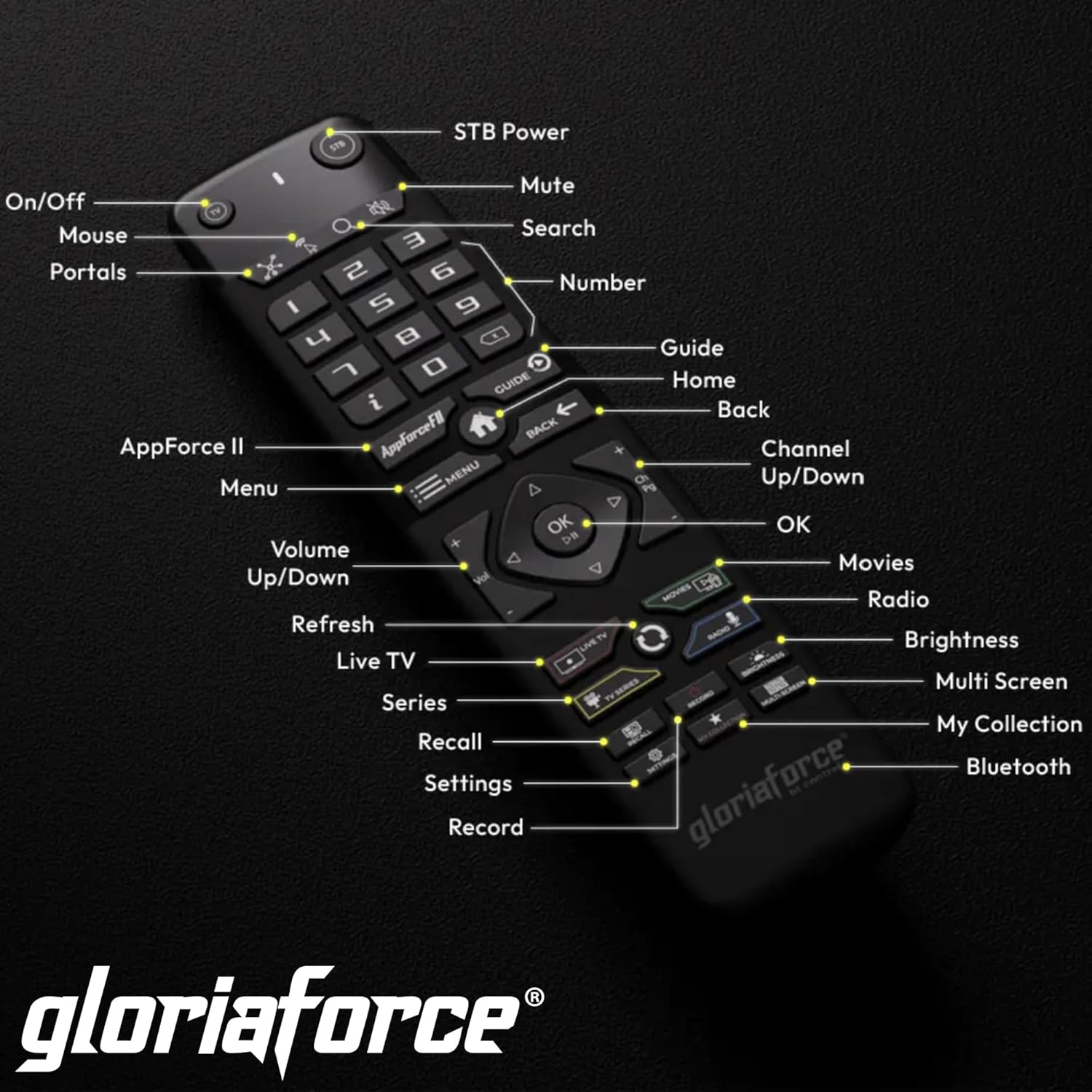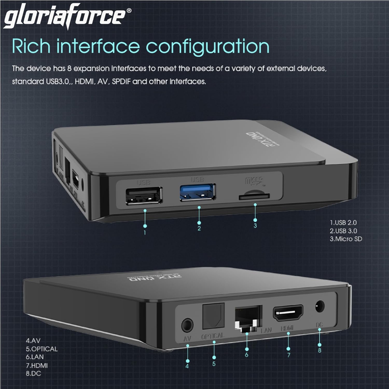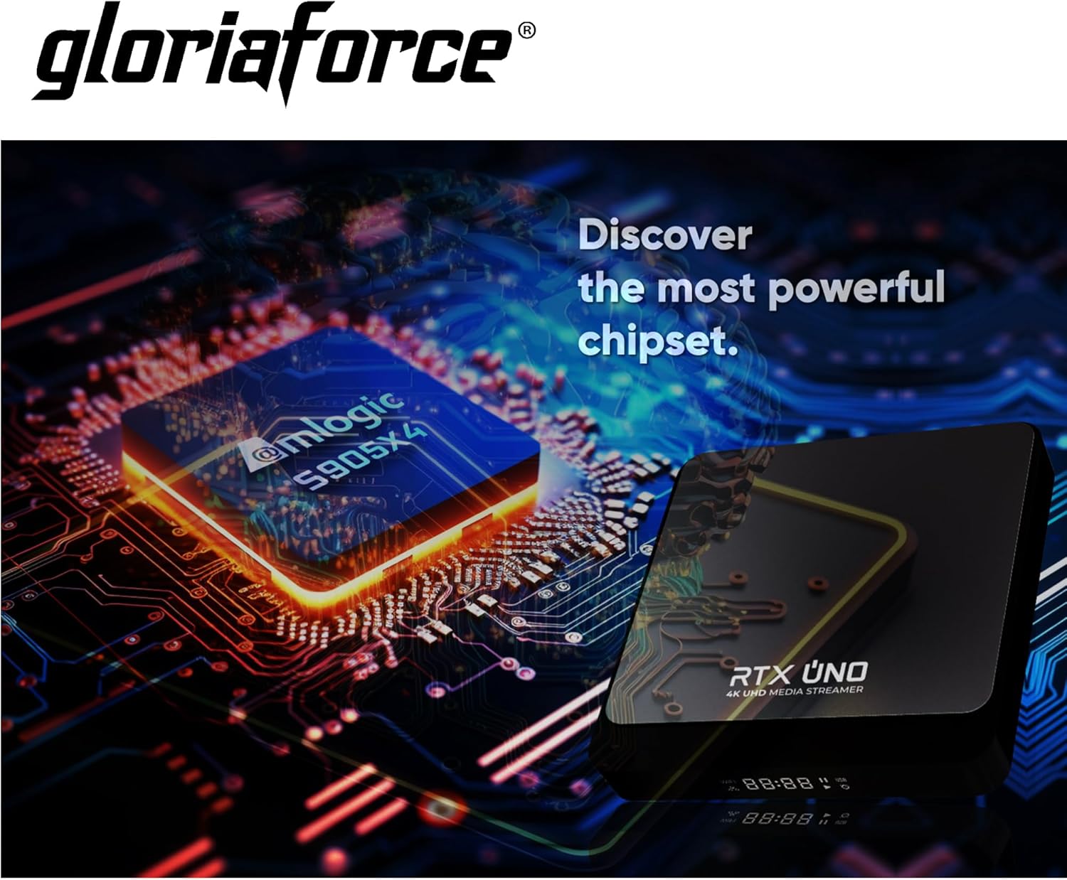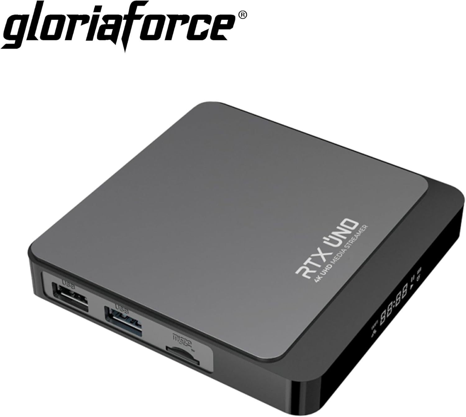 GloriaForce RTX UNO 4K UHD Android 11.0 TV Box 2GB RAM, 16GB Flash, 1GBps LAN, 5G WiFi, App Force II, S905X4 Quad Core ARM Cortex A55, ARM G31 GPU, BT дистанционно управление, HTS e-com HDMI