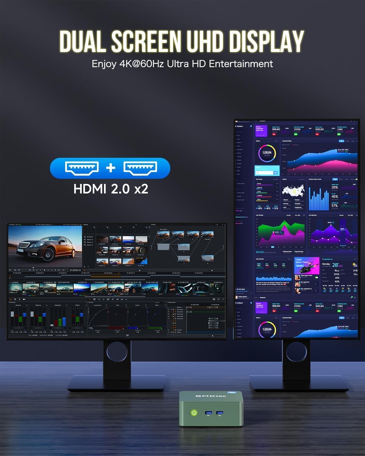 • 【4K дисплей с два екрана】Мини настолният компютър G3 Plus поддържа възпроизвеждане на 4K видео и AV1 декодиране. Можете да свържете компютъра към проектор и да го използвате като домашно кино за разнообразно развлекателно изживяване. Благодарение на двата HDMI 2.0 порта, можете ефективно да работите едновременно на два 4K@60Hz дисплея.
