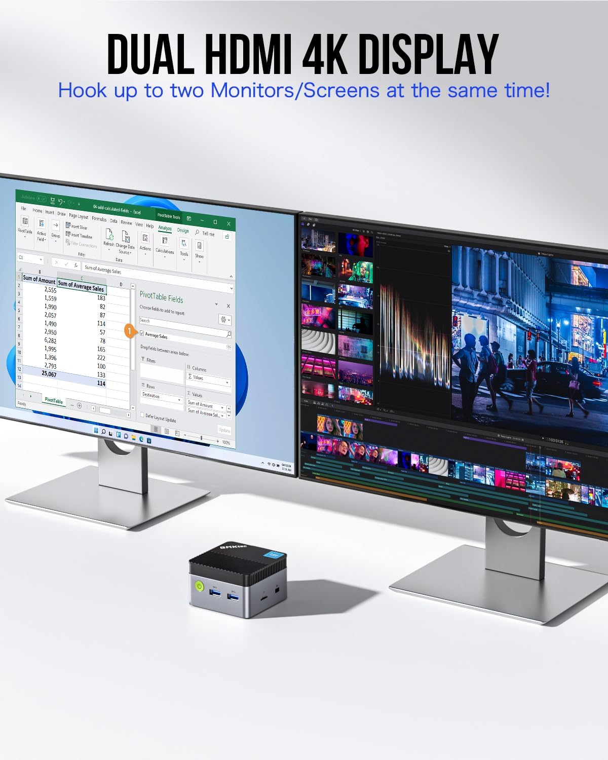 • 【HDMI 4K@60Hz HD дисплей】Настолният мини компютър G5 Micro поддържа 4K UHD изход с резолюция 4096 x 2160 @ 60 Hz и динамична честота от 1200 MHz, осигурявайки ви визуално изживяване като в киносалон. С два HDMI порта можете да свържете два дисплея едновременно, създавайки по-голямо работно пространство и наслаждавайки се на 4K Ultra HD качество на картината и забавление, като същевременно удвоявате работната си ефективност.