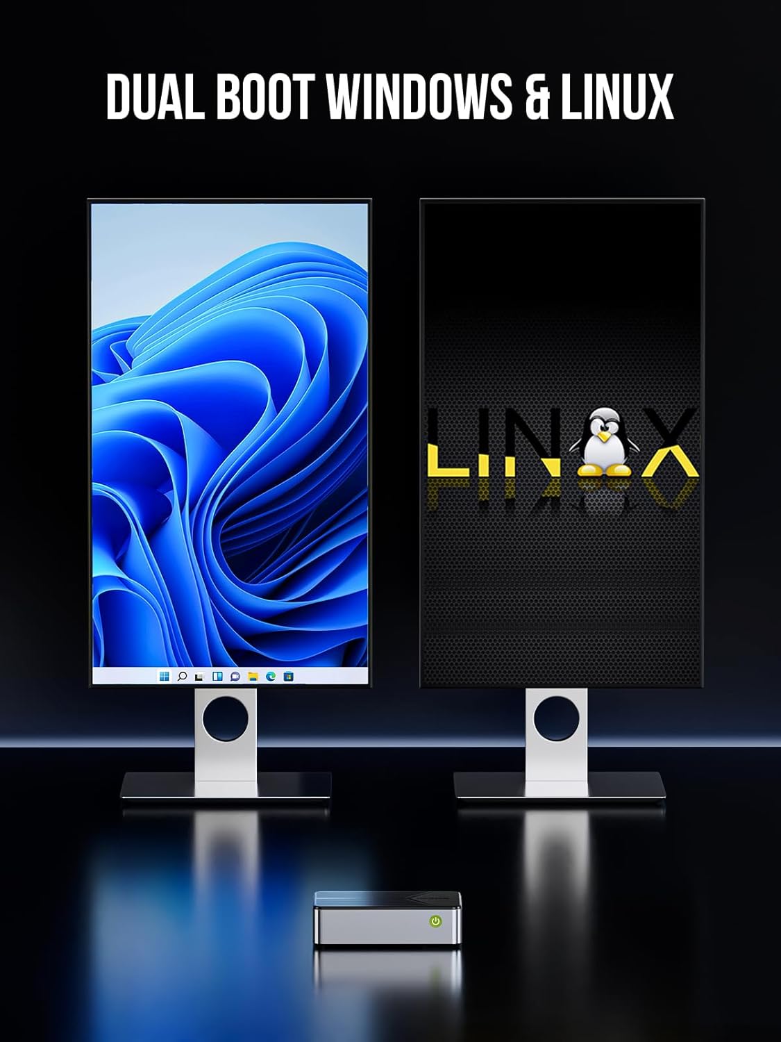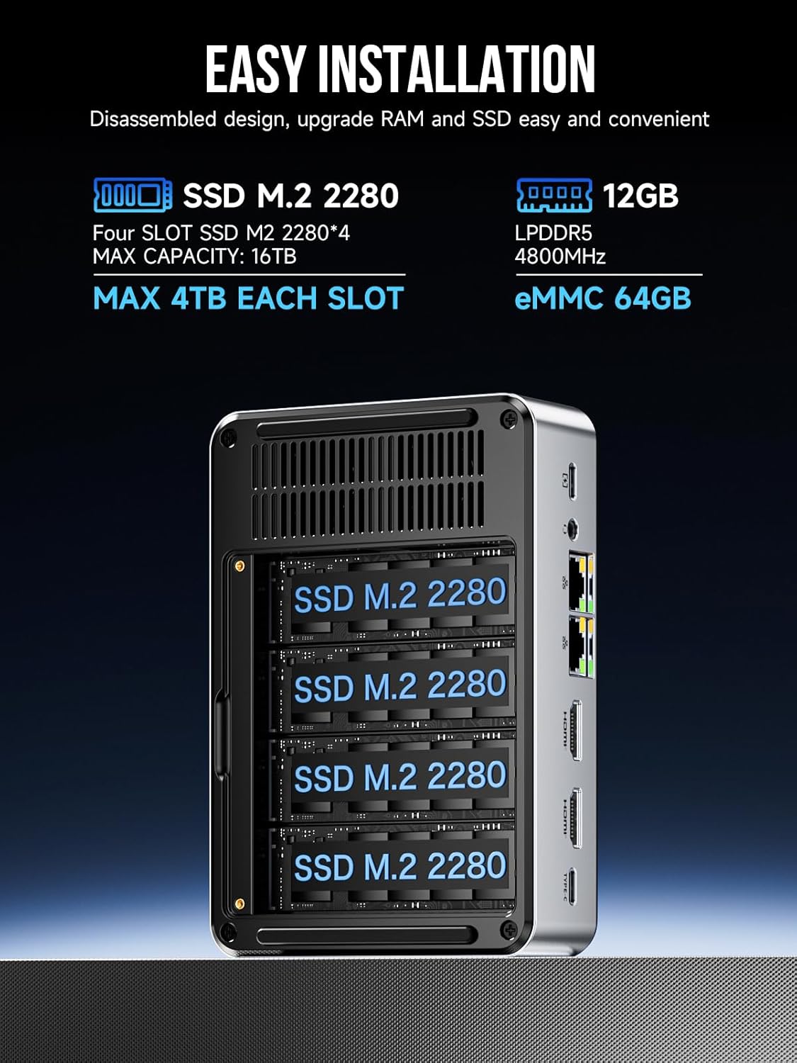 GMKtec Ubuntu Мини компютър Linux NAS, G9 Intel N150 Dual Boot Linux + OS Мини компютър 12GB DDR5 64GB EMMC + 1TB M.2 SSD, 4*M.2 NVMe слота, двоен NIC 2.5GbE, USB-C/USB 3.2 10Gbps, мрежово свързано устройство за съхранение