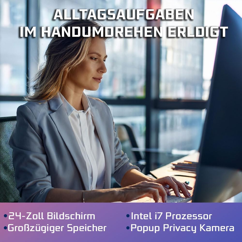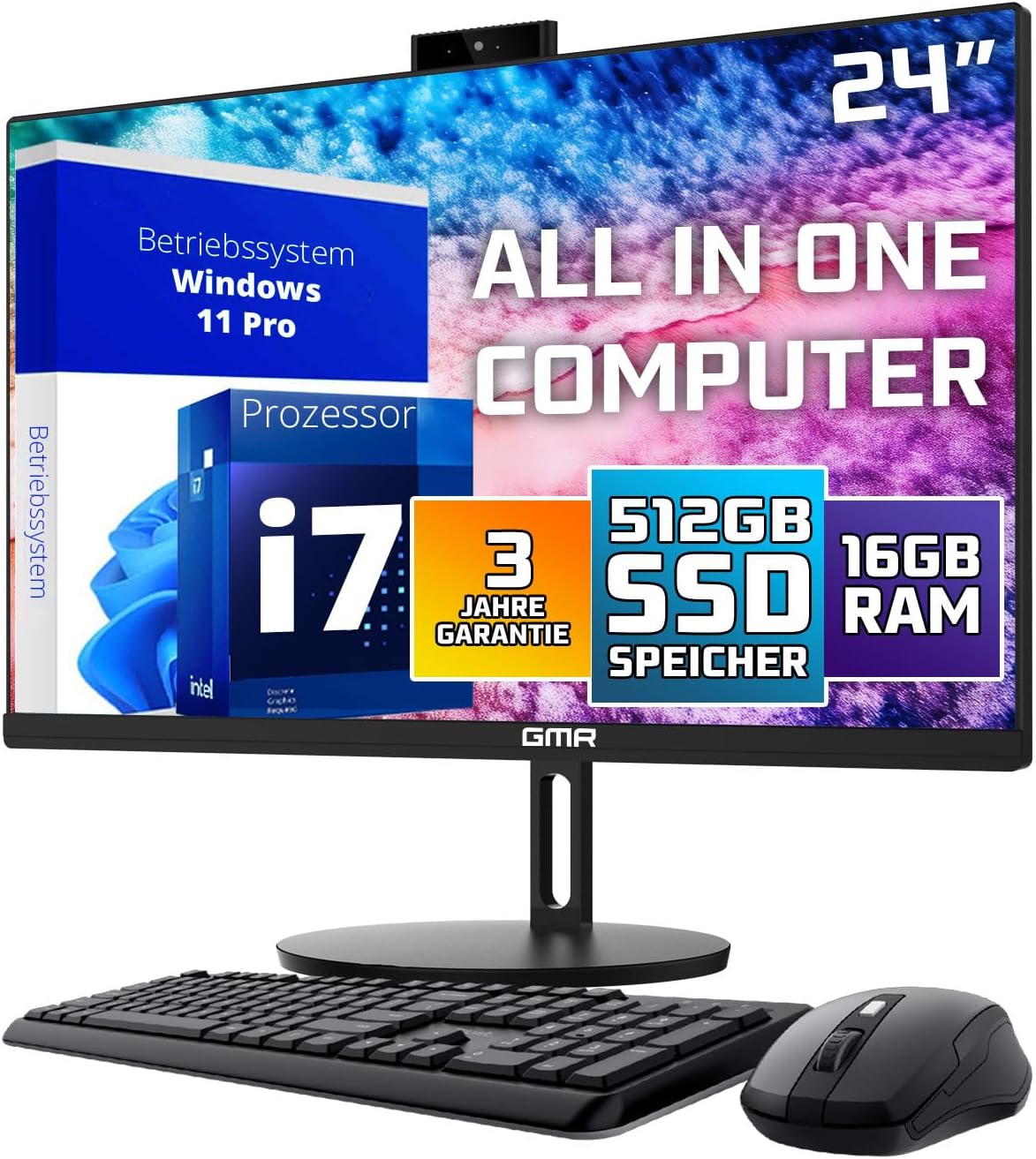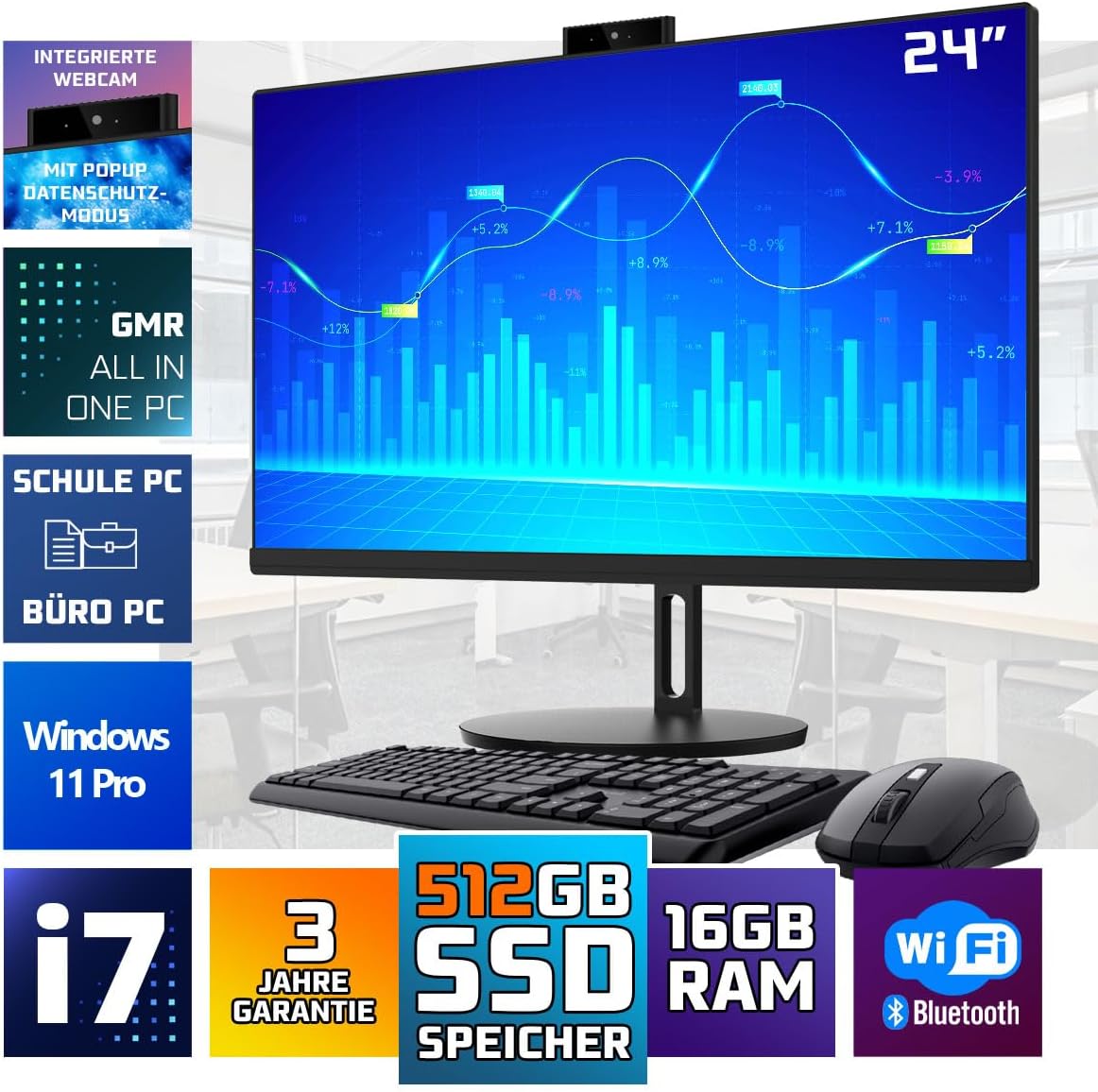 Този GMR компютър „всичко в едно“ е готов за работа! Просто включете компютъра и сте готови. Той се предлага напълно сглобен с предварително инсталиран Windows 11 Pro и най-новите налични драйвери и актуализации за сигурност (plug & play). Компютърът интелигентно използва процесор с вградена видеокарта. Надеждният процесор Core i7, комбиниран със свръхбързия и енергийно ефективен SSD, гарантира бързо зареждане на Windows 11 и приложенията/програмите. Захранването е сертифицирано за оптимална ефективност (80P) и енергийна ефективност.