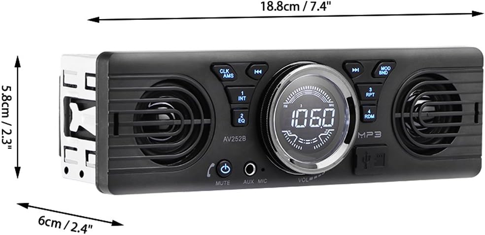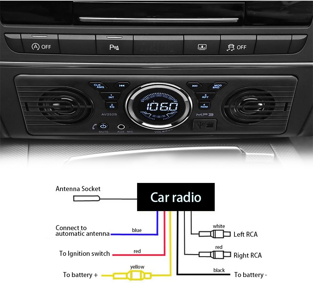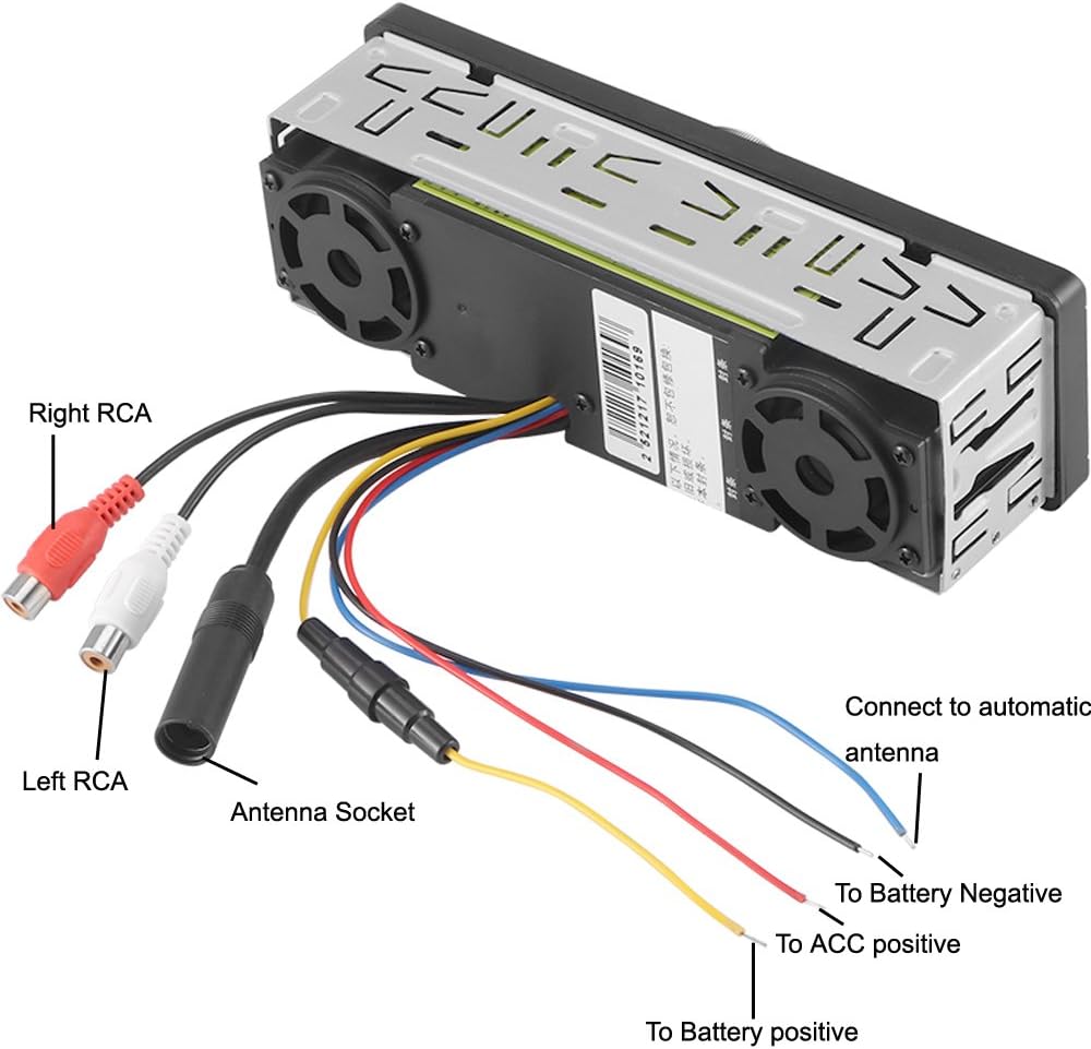 Функции: 1 DIN версия, LCD дисплей, подходящ за повечето типове превозни средства. Поддържа MP3/WMA аудио формат без загуби. USB портът поддържа и всички видове мобилни устройства като смартфони, таблети, Map3, MP4 и др. Поддържа функцията за запазване на последната песен. (Радио и SD/MMC и USB) Избор на множество еквалайзери за сцена: джаз, рок, поп, класика. Забележка: Инсталирането на този продукт изисква професионални умения. Ако не, моля, консултирайте се с професионалист. Подробности можете да намерите в ръководството за употреба (английският език не е гарантиран). Спецификация: Поддържан музикален формат: WMA/MP3 FM обхват на приемане: 87.5-107.9MHz Мощност на високоговорителите: Макс. 5W * 2 Импеданс на високоговорителите: 4~8 Ω Честотна лента: 100-10KHz Баланс на стерео каналите: ? 3 dB Съотношение сигнал/шум: > 45 dB Захранване: DC 12 V Интерфейс: 1 x USB порт, 1 x слот за TF карта, 1 x Aux-in. Размер на артикула: 18,8 x 6 x 5,8 см / 7,4 x 2,4 x 2,3 инча (Д x Ш x В). Опаковка: 1 x MP3 плейър за кола. 2 x 1 * ръководство за потребителя на английски и китайски език, 1 x кутия. Моля, проверете плюсовите и отрицателните кабели на вашия автомобил преди монтаж. След това инсталирайте устройството, като следвате следните съвети, в противен случай може да не успее да стартира или дори да го повреди: (Моля, НЕ свързвайте кабелите на устройството директно със същия цвят като кабелите на автомобила, тъй като понякога това може да е неточно.) Правилен метод на окабеляване: свържете жълтия кабел към плюса на батерията, свържете черния кабел към минуса на батерията, свържете червения кабел към превключвателя за запалване ACC. Синият кабел може по избор да бъде свързан към антената на автомобила. (Свържете този син кабел според изискванията на вашия автомобил. Ако не свържете синия кабел, уверете се, че главата на кабела остава изолирана.)