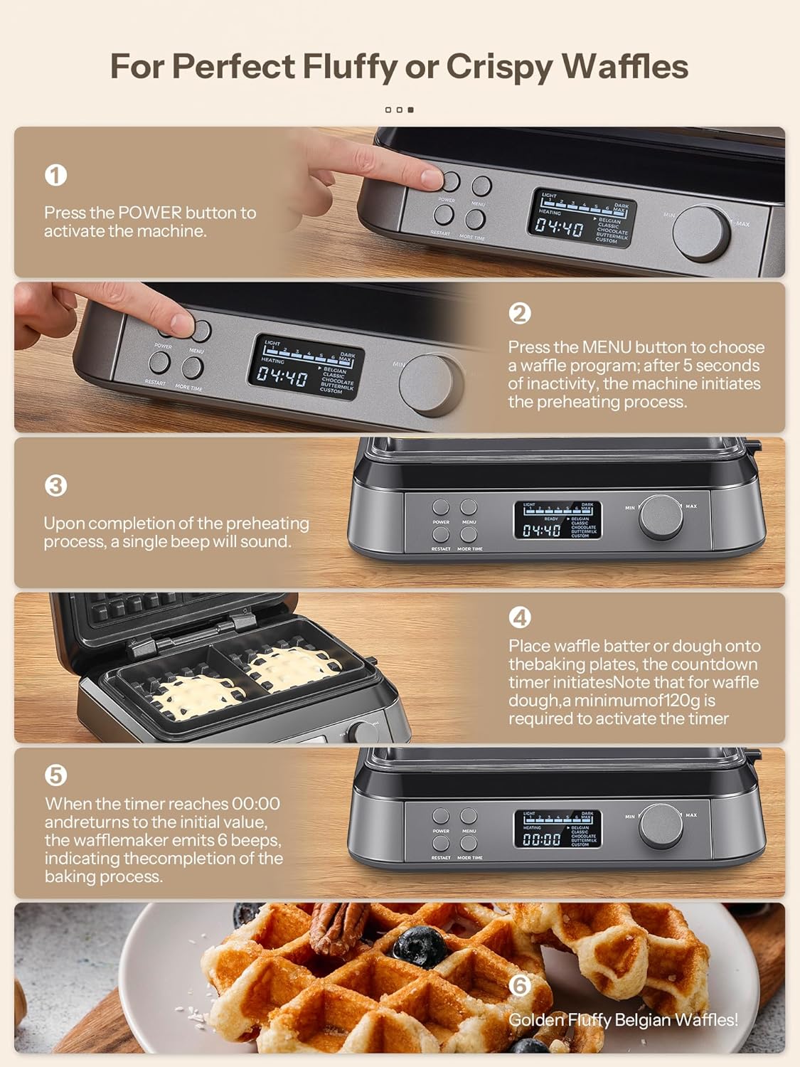 • Интелигентно печене: 5 програми за печене (белгийски гофрети, шоколадови гофрети, класически гофрети, гофрети с мътеница, CUSTOM), 7 регулируеми нива на изпичане, избираема текстура (мека отвътре и хрупкава или хрупкаво изпечена отвън).