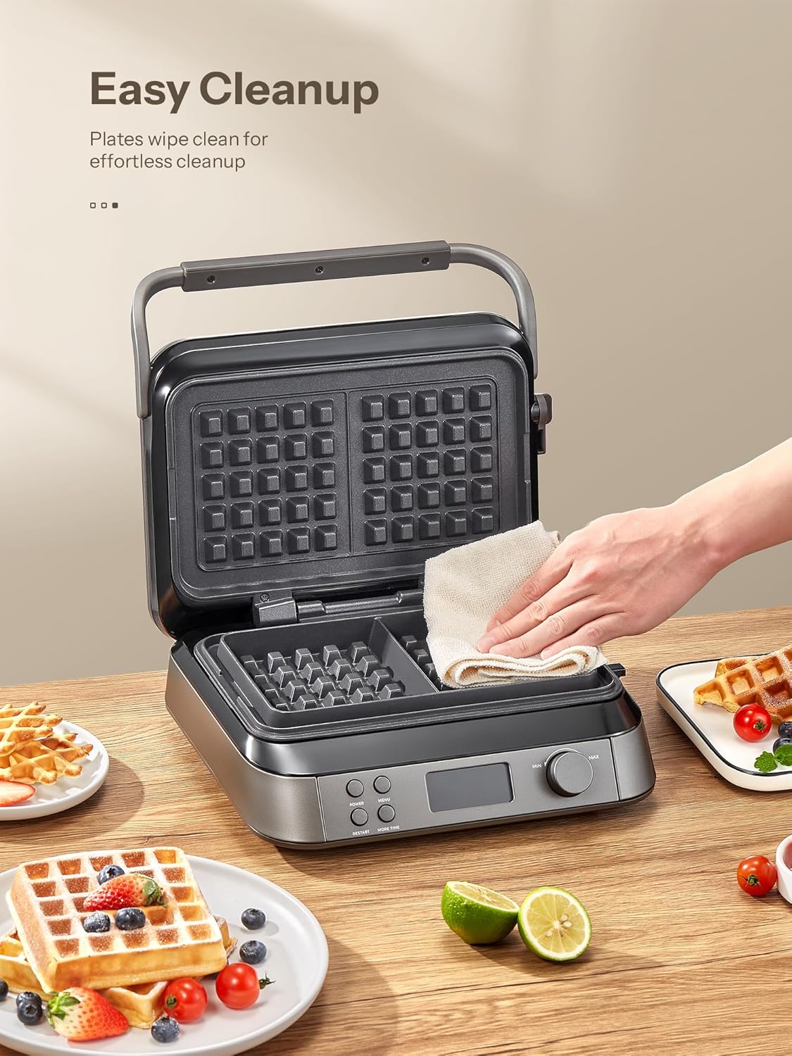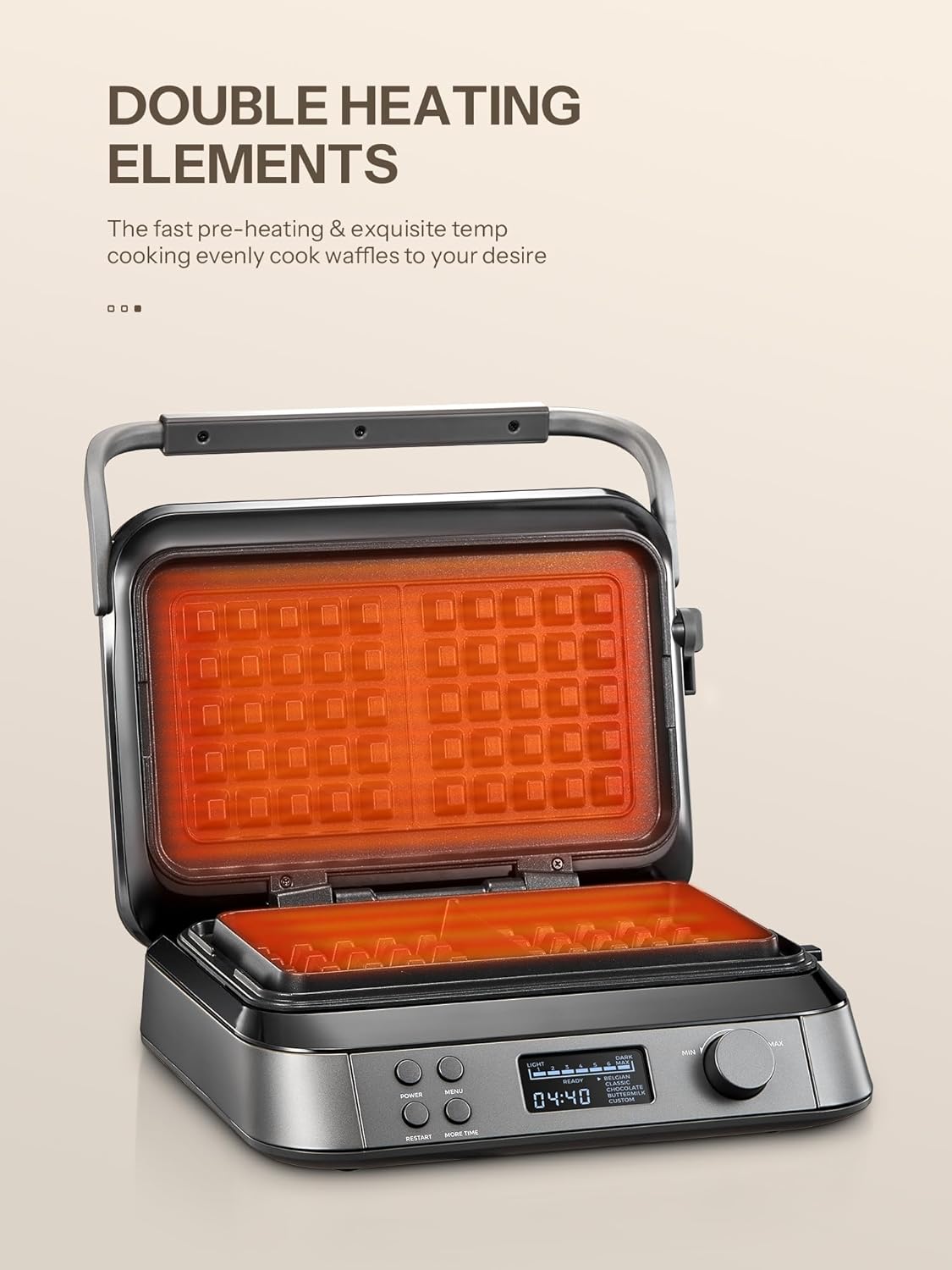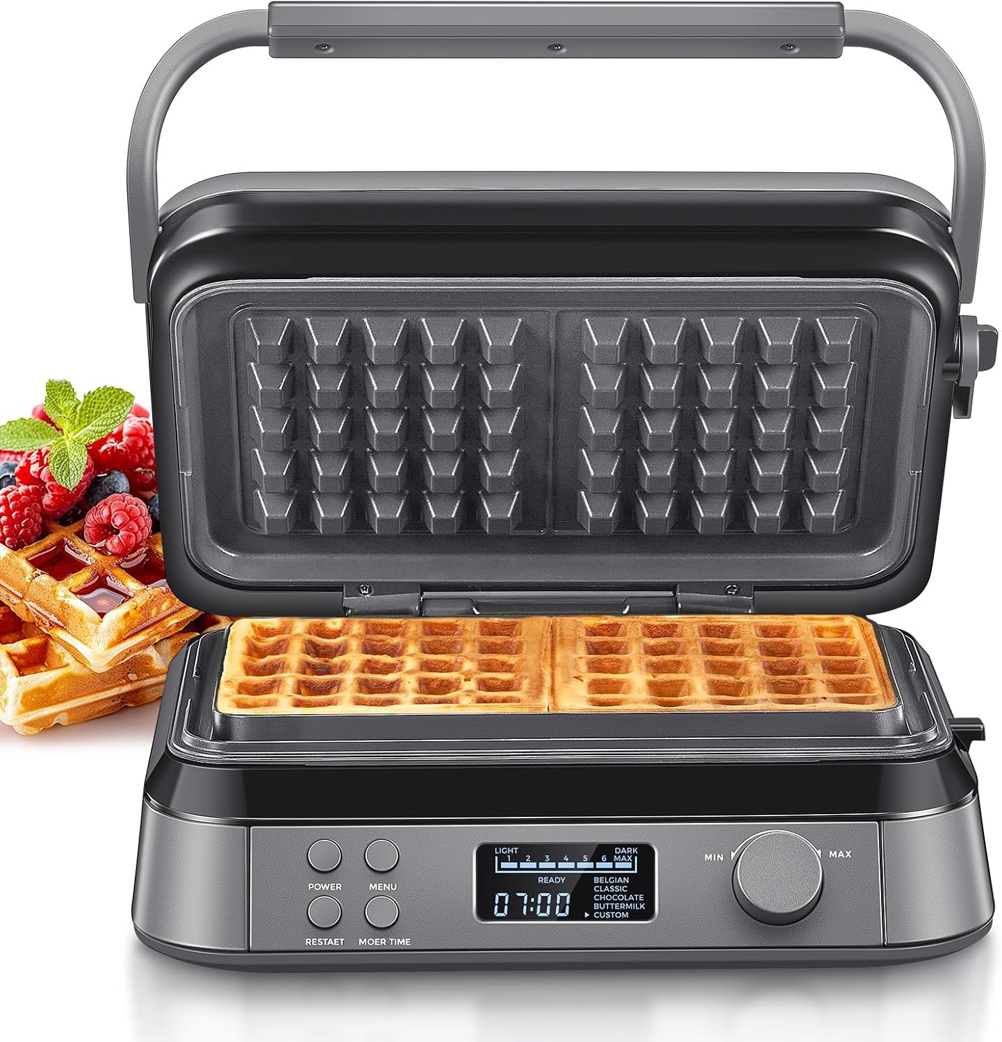 Гофретник 1600 W, Двоен гофретник за белгийски гофрети, 5 програми, 7 нива на изпичане, Управление чрез LCD дисплей, Таймер, Практичен жлеб за преливане, Неръждаема стомана