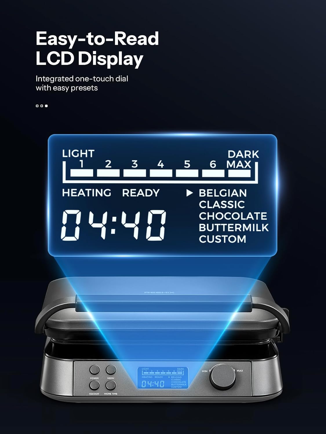 • ЗВУКОВ СИГНАЛ - Таймерът за обратно броене показва оставащото време за печене на LCD дисплея. След като капакът се затвори, таймерът и индикаторът за състоянието се стартират автоматично (твърдото тесто трябва да тежи повече от 120 г, за да се задейства обратното броене). Звуков сигнал се чува, когато процесът на печене приключи. Благодарение на вградения таймер, никога повече няма да се налага да се фокусирате върху печенето на гофрети и вместо това ще се наслаждавате на отличните си гофрети спокойно.
