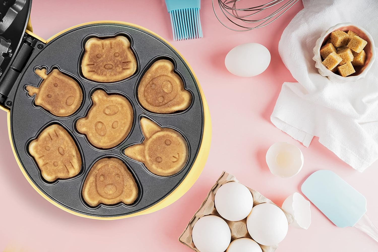 Гофретник Bestron за мини кексчета, мини уред за кексчета с животински мотиви, гофретник за гофрети, със светлина за печене и незалепващо покритие, 700 W, цвят: жълт
