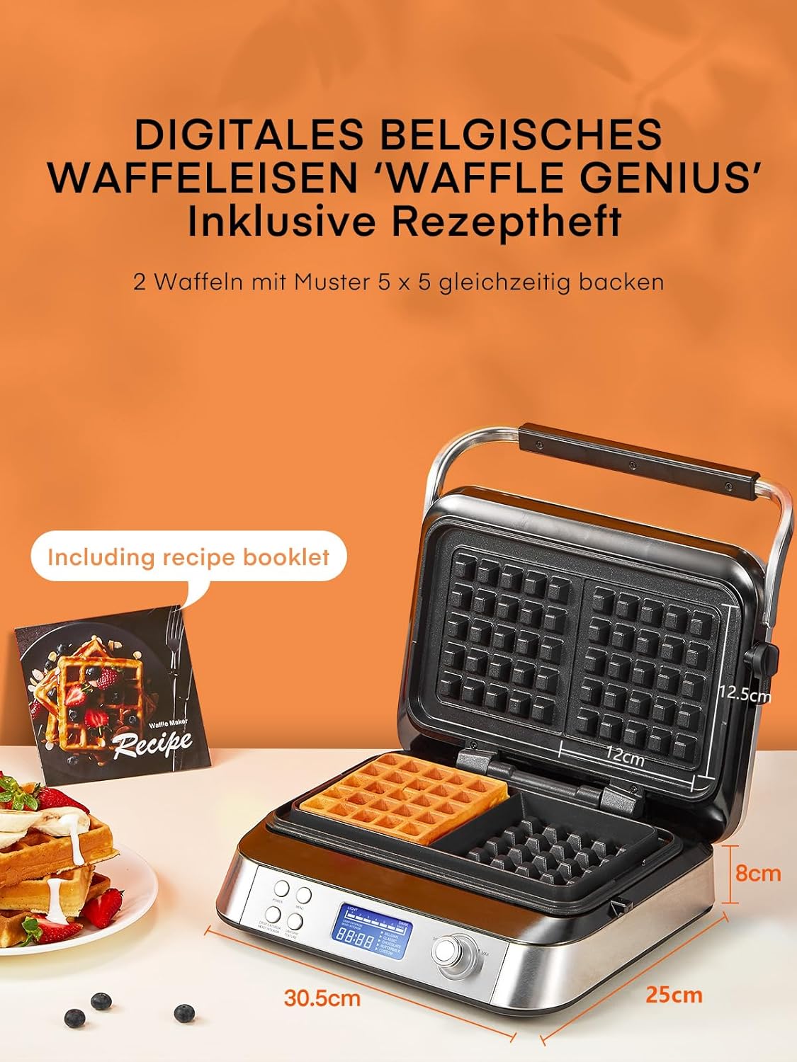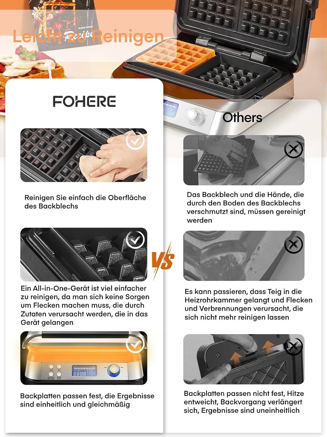 Гофретник FOHERE 1600 W, Двоен гофретник за белгийски гофрети, 5 програми, 7 нива на изпичане, LCD дисплей, таймер за обратно броене, жлеб за преливане, изключително дълбоки нагревателни плочи