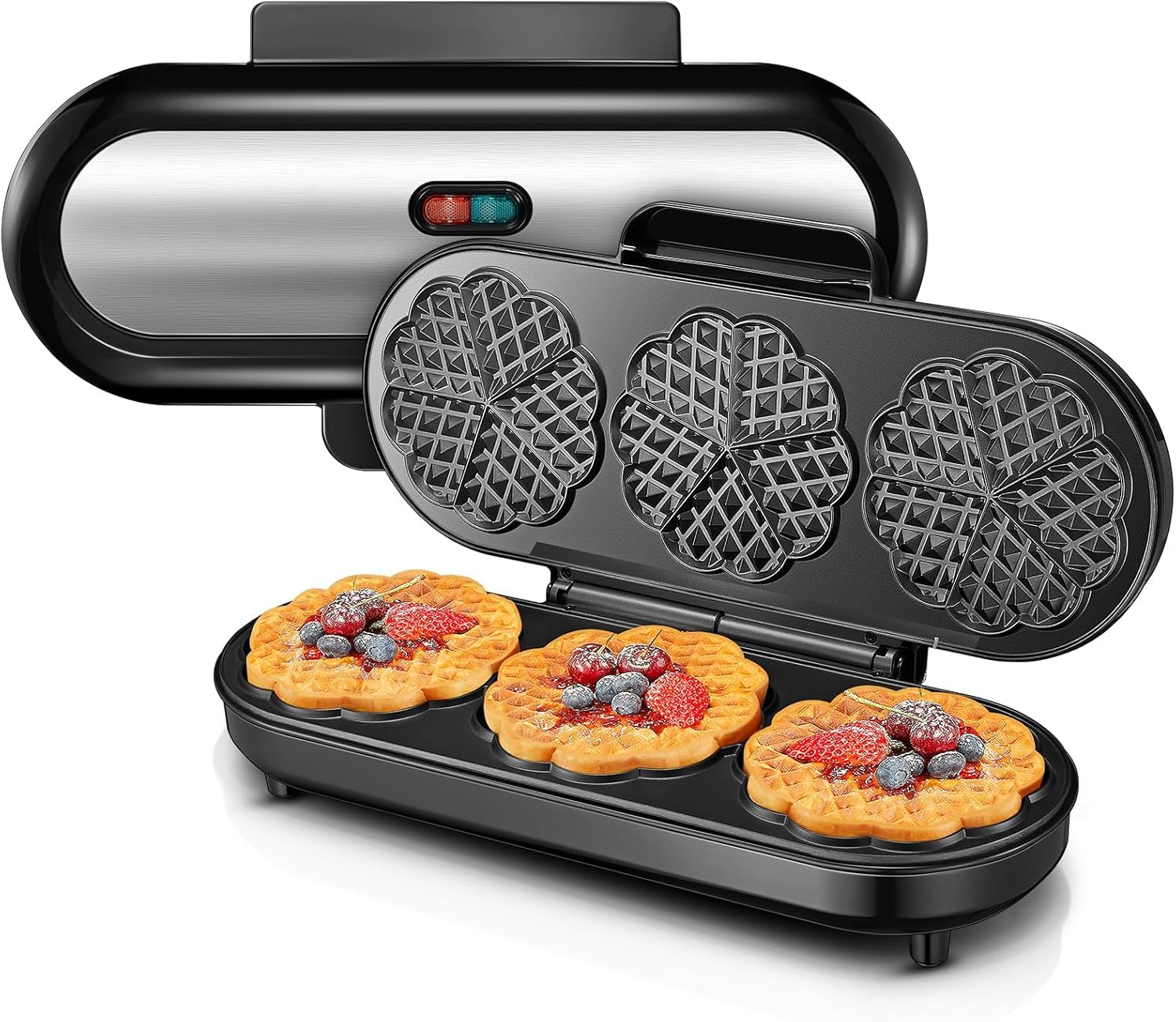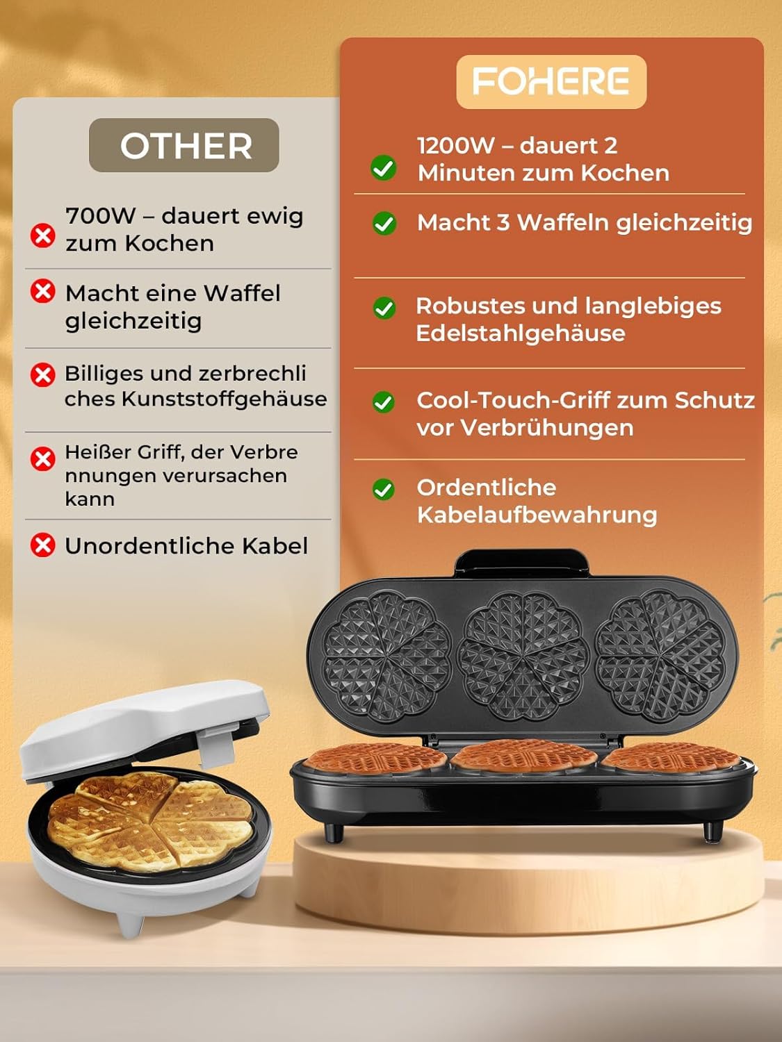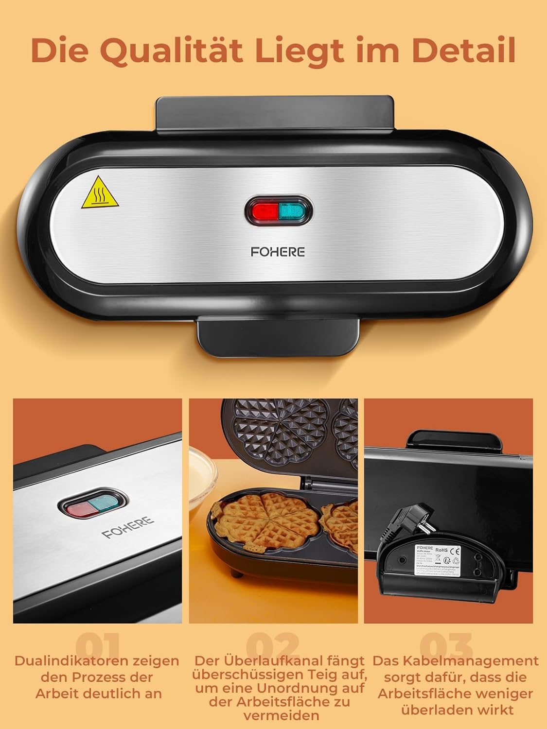 • Лесна употреба: два лесни за четене индикаторни светлини, зелената светлина показва процеса на нагряване. Индикаторните светлини осигуряват лесна работа и контрол. Регулируемата, гъвкава панта осигурява повече място за по-пухкави гофрети. Защитата от прегряване и топлоизолираните дръжки осигуряват безопасна работа.