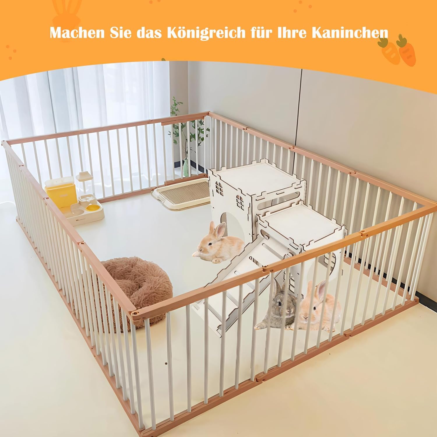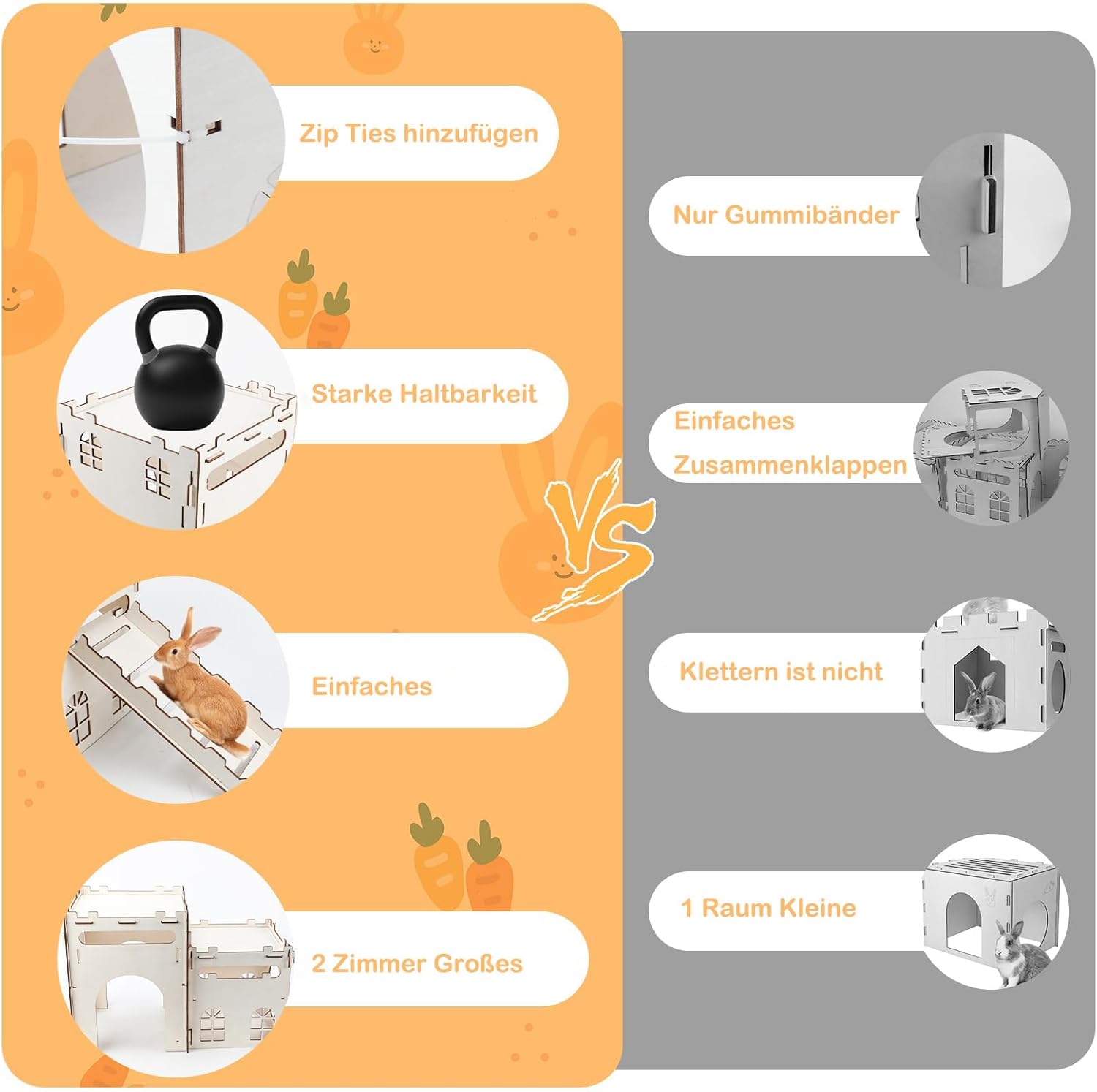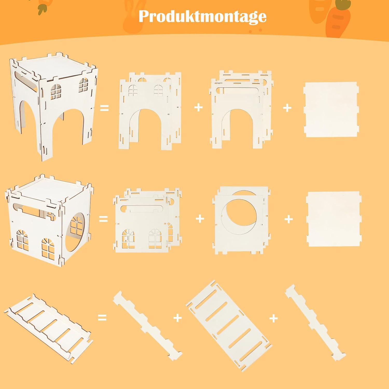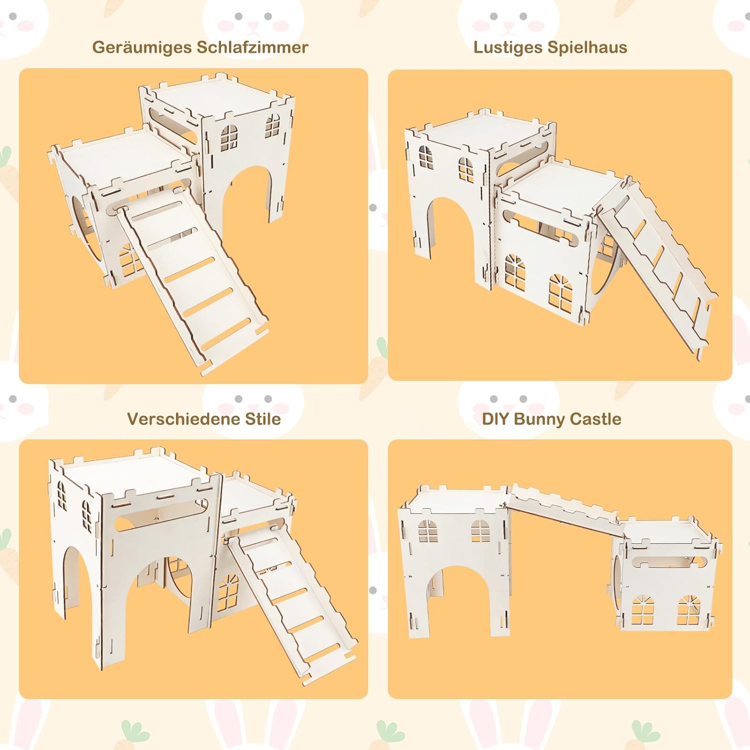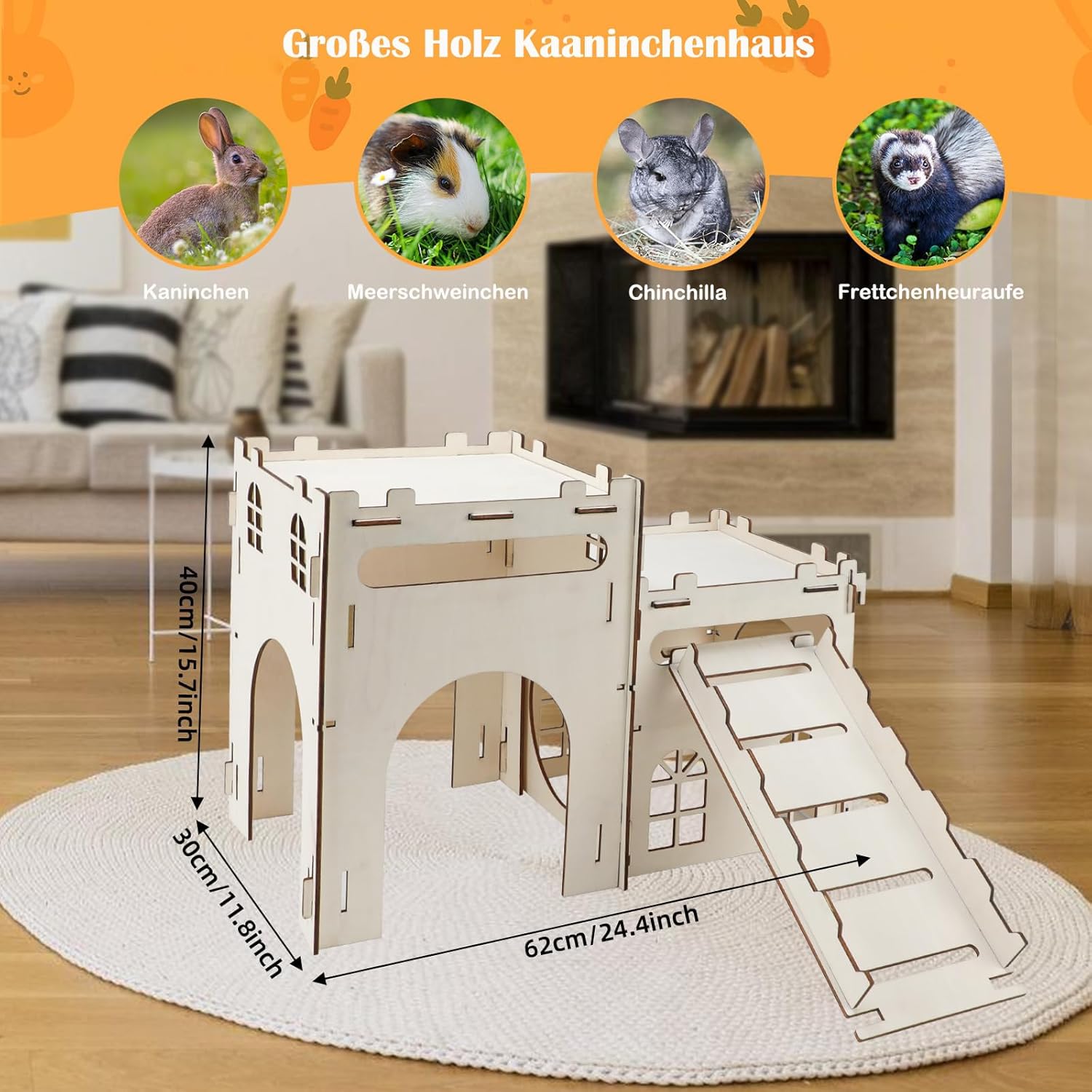 • Перфектното разбирателство: замъкът се състои от пет части - четири малки къщички и стълбище, което е лесно за изкачване. С размери 60 x 30 x 40 см, той предлага много място за катерене, когато е сглобен, и е идеален за зайци, морски свинчета, хамстери или чинчили.