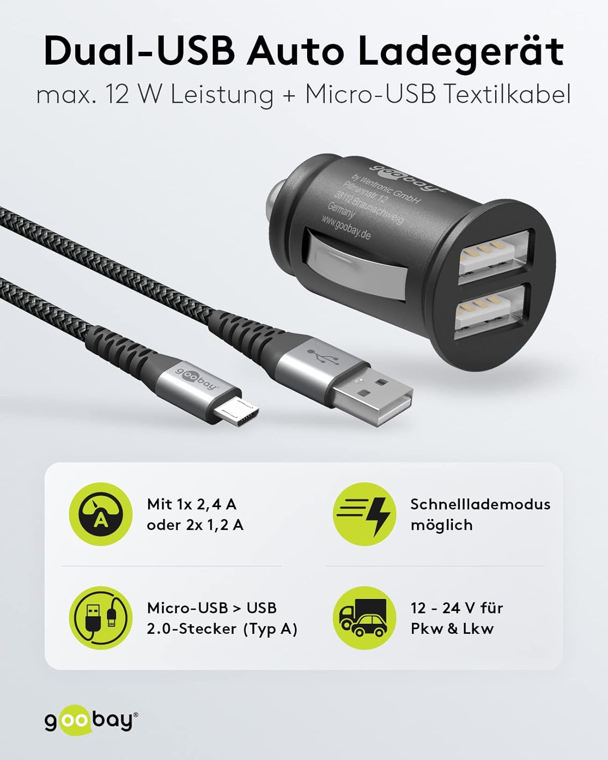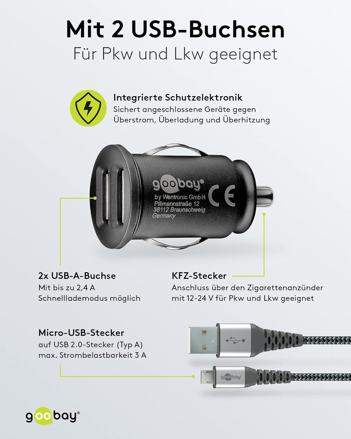 Goobay 64803 2-портово USB зарядно за запалка 2.4 A - Двоен USB адаптер за запалка - Двойно зарядно за кола - Подходящо за автомобили и камиони (12 V / 24 V) с 1 м Micro USB кабел