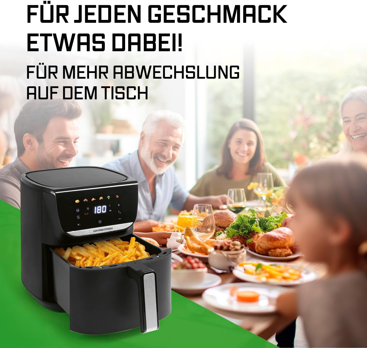 • Фритюрник без олио - Фритюрникът с горещ въздух GOURMETmaxx позволява готвене с особено ниско съдържание на мазнини и щадящо. Той поддържа избраната температура, така че всяко ястие може да бъде приготвено перфектно и прецизно с таймер.