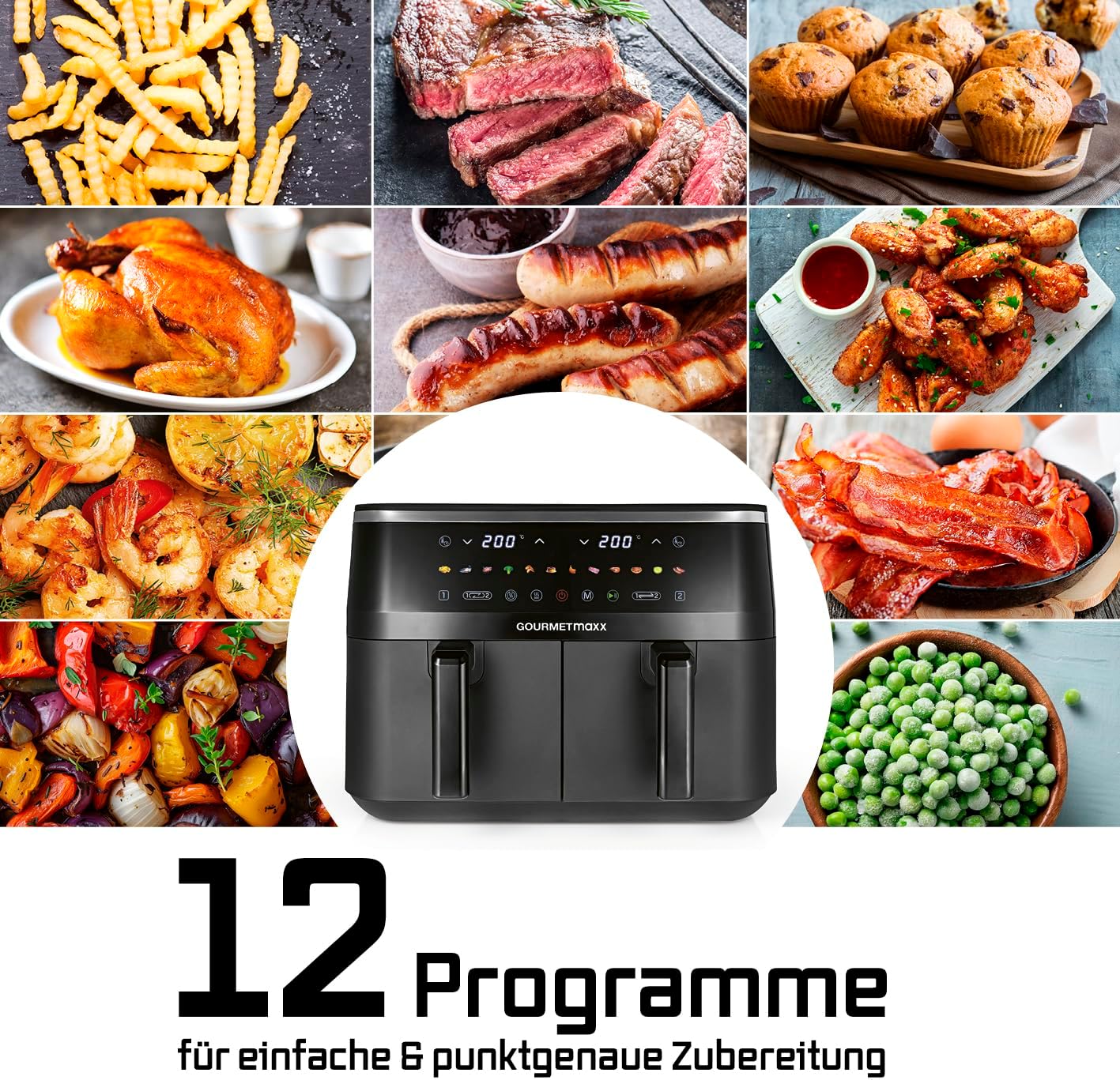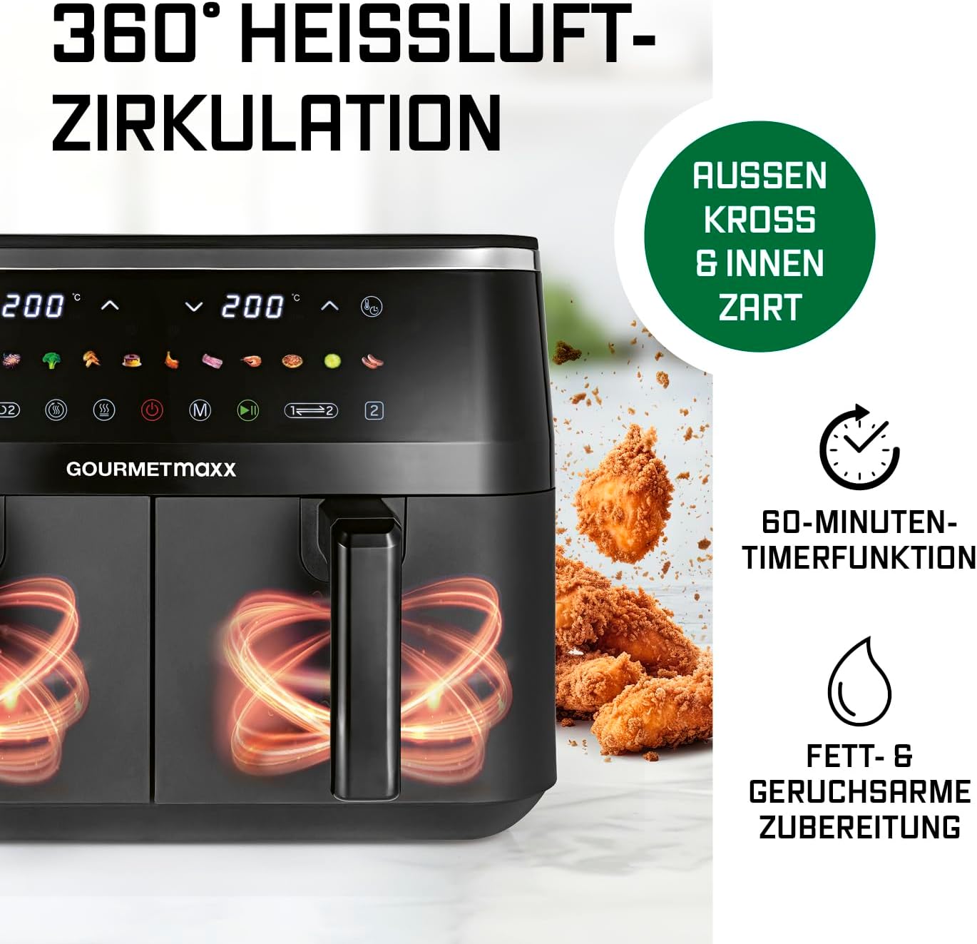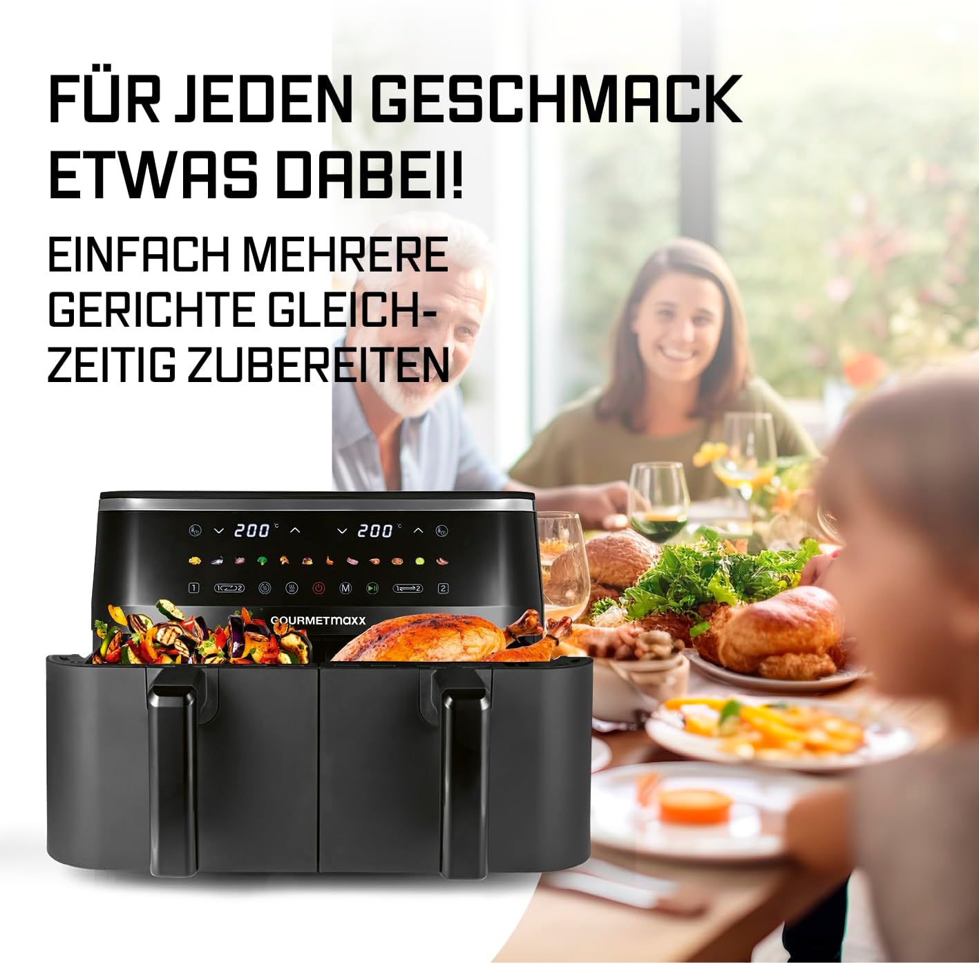GOURMETmaxx Фритюрник с двойна камера и горещ въздух - 2 x 4,5 л | Синхронизирани зони за готвене | Фритюрник с LED сензорен екран, цветни икони | Фритюрник с горещ въздух, 2 камери с 12 програми | Пържене почти без олио