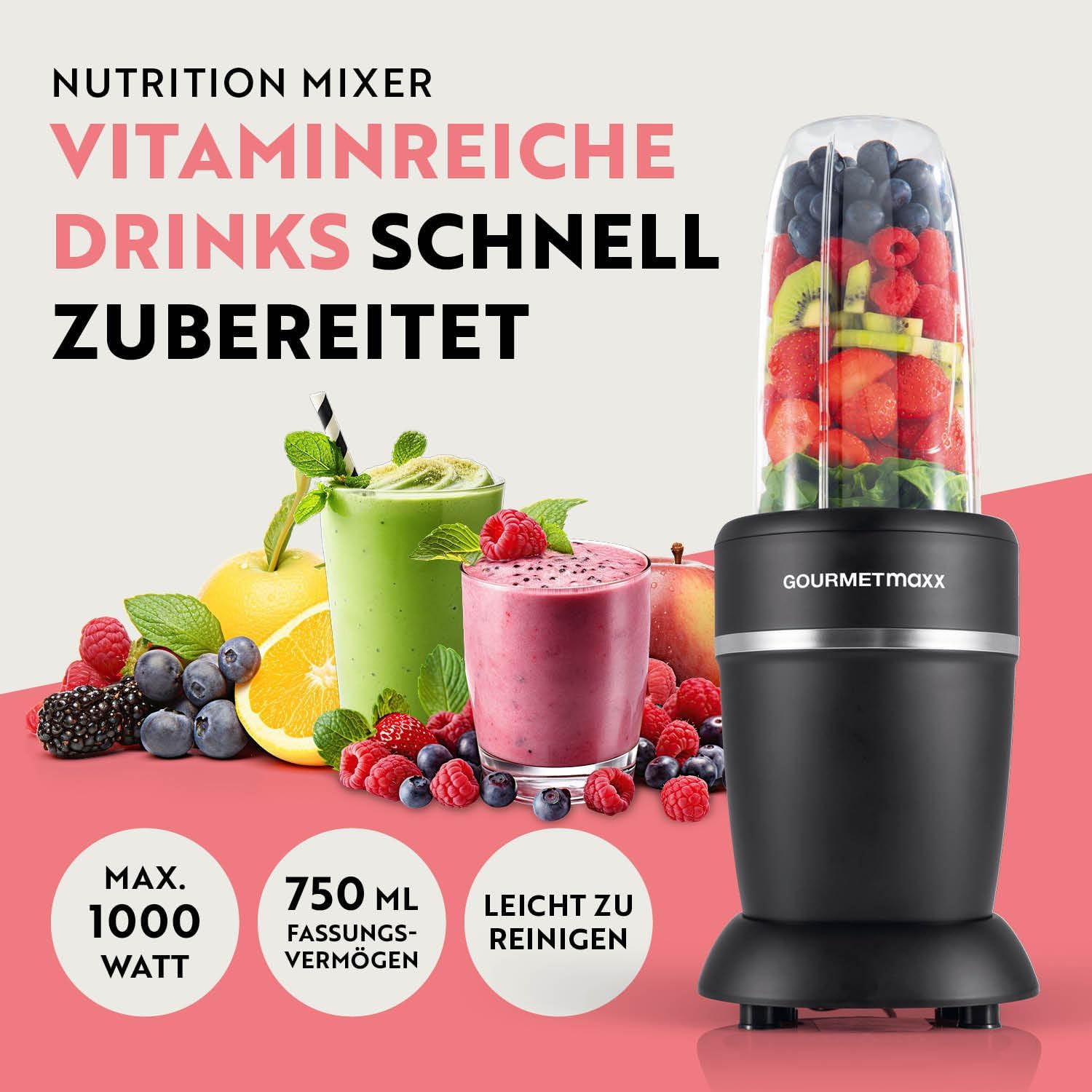 GOURMETmaxx Миксер и машина за смутита 4 части | Електрически миксер за витамини Kick to Go | Миксер за хранителни вещества с капак против протичане | Блендер, кухненски робот за шейкове и др.