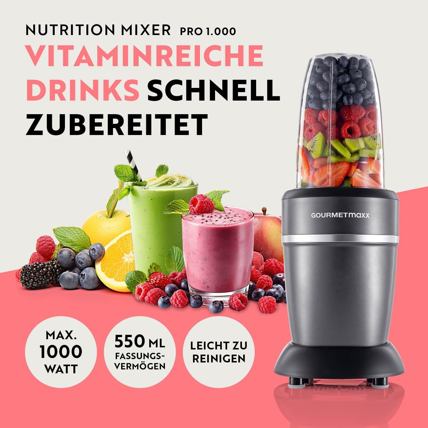 GOURMETmaxx Миксер и машина за смутита 4 части | Електрически миксер за витамини Kick to Go | Миксер за хранителни вещества с капак против протичане | Блендер, кухненски робот за шейкове и др.