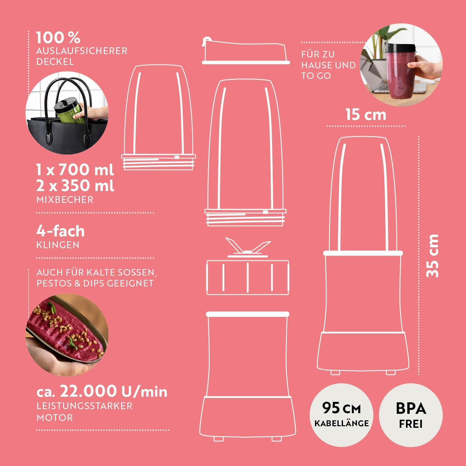 • Лесен за употреба: блендерът е за плодове, зеленчуци и др. Размери (В x Ш) приблизително 37x17,5 см. Това го прави подходящ дори за малка кухня. Управлението е супер практично: просто завъртете приставката, разбъркайте - готово! След това малкият миксер може лесно да се почисти и прибере.